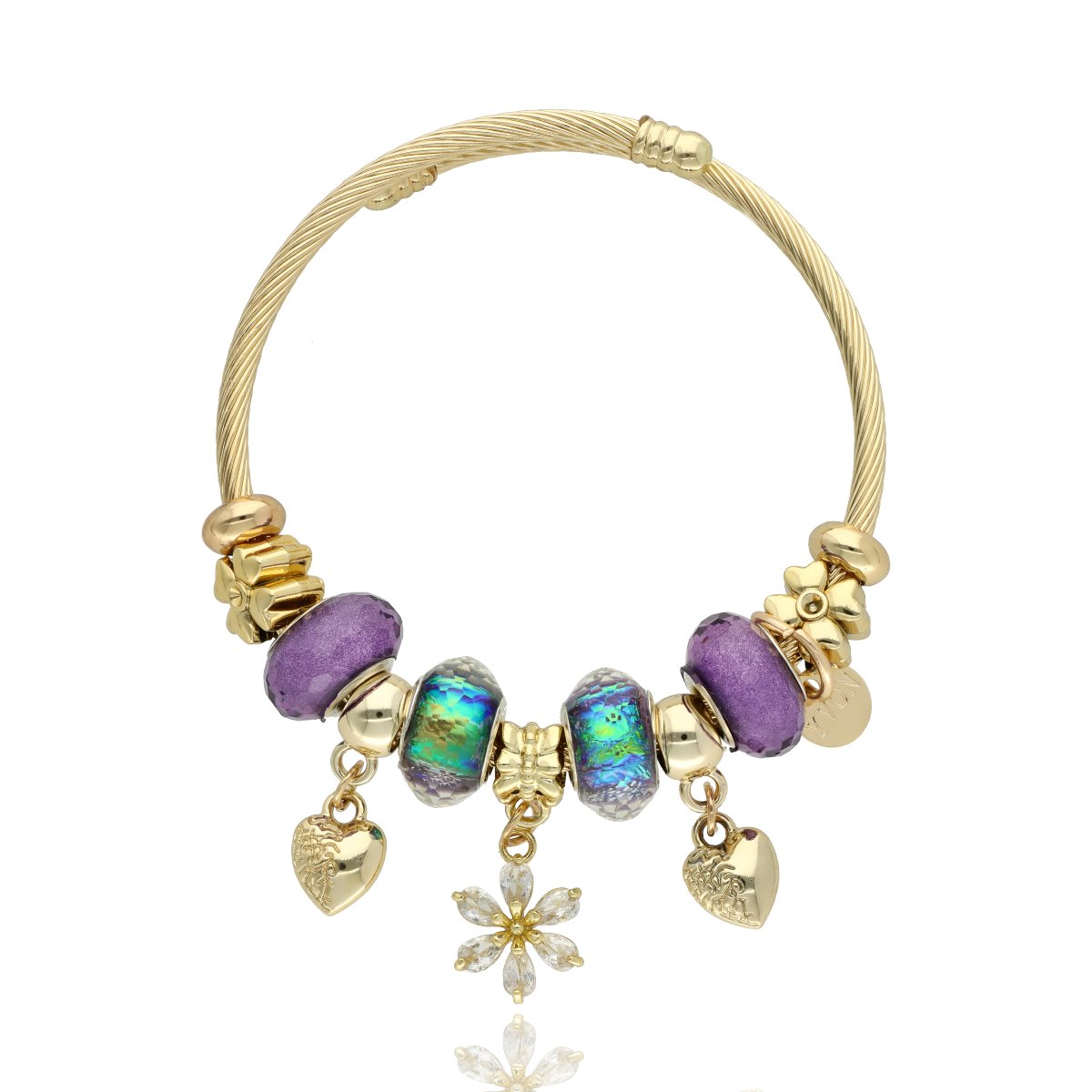 Urocza bransoletka wykonana ze stali szlachetnej (obręcz) oraz zamaku, szkła fasetowanego, ceramiki i emalii (czarmsy). W eleganckim PUDEŁECZKU GRATIS - idealny pomysł na prezent. Biżuteria hypoalergiczna.