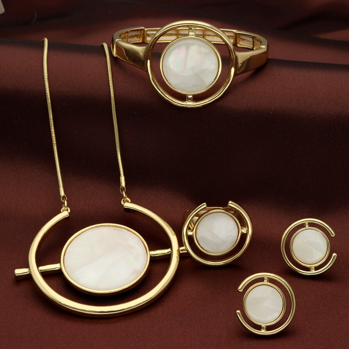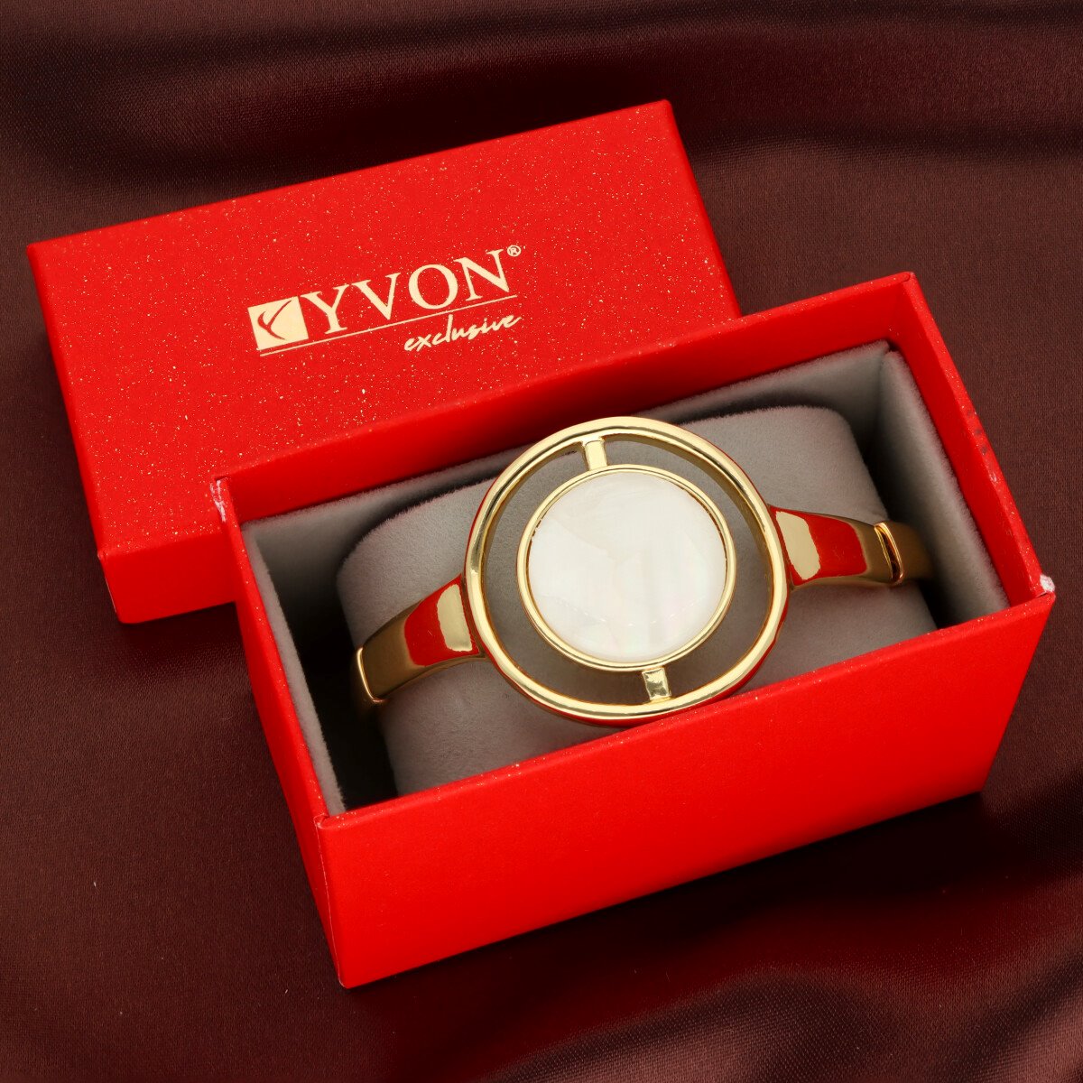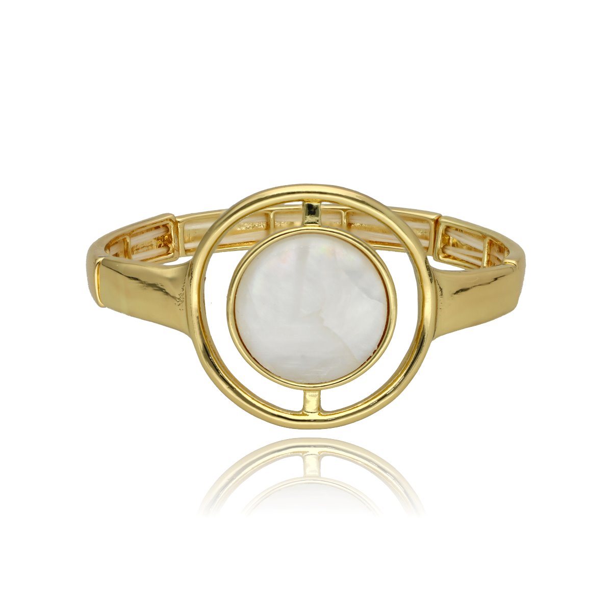 Stylowa bransoletka na elastycznej gumce, wykonana z metalowych, antyalergicznych elementów i muszli naturalnej mlecznej.