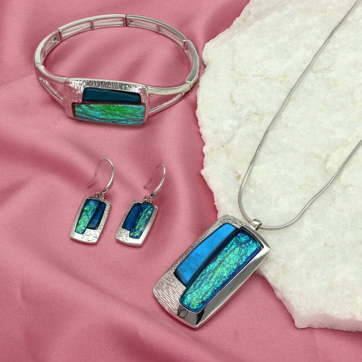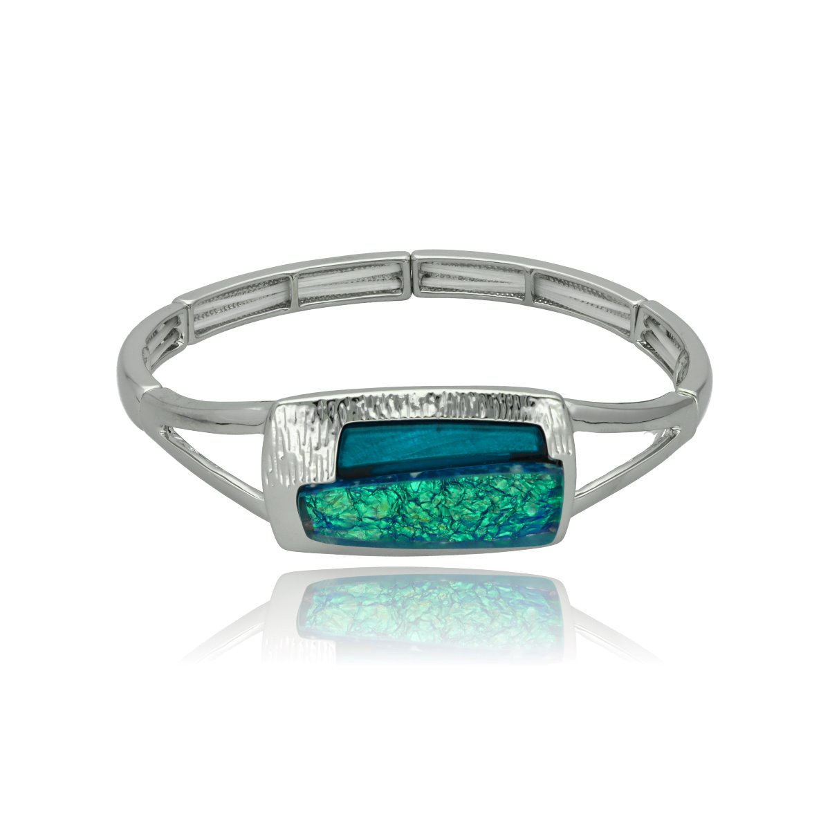 Elegancka bransoletka wykonana z metalu antyalergicznego i żywicy. Rozmiar uniwersalny (na rozciągliwych gumkach). Szukaj do kompletu naszyjnika i kolczyków o tym samym indeksie numerycznym.