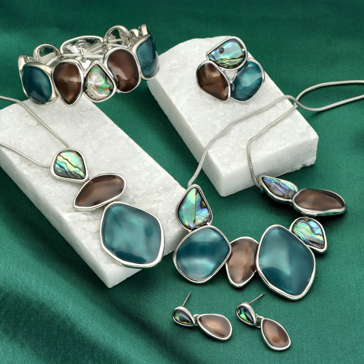 Uniwersalna, rozciągliwa bransoletka stworzona z elementów z kolorowej żywicy, emalii oraz naturalnej muszli. Osadzona na elastycznej gumce, dopasowuje się do większości nadgarstków, zapewniając komfort i wygodę noszenia.