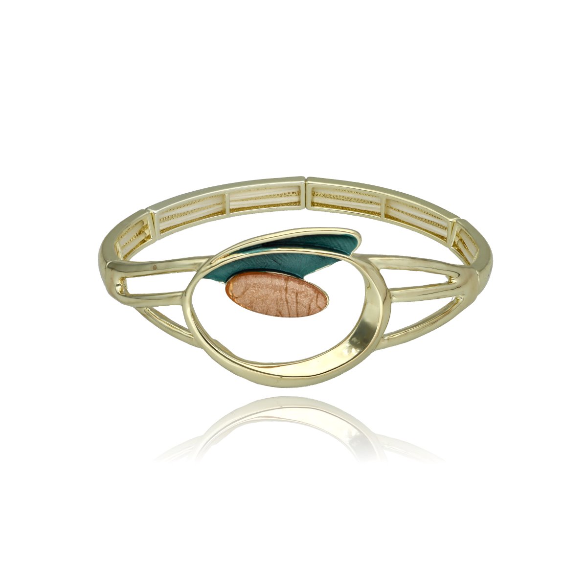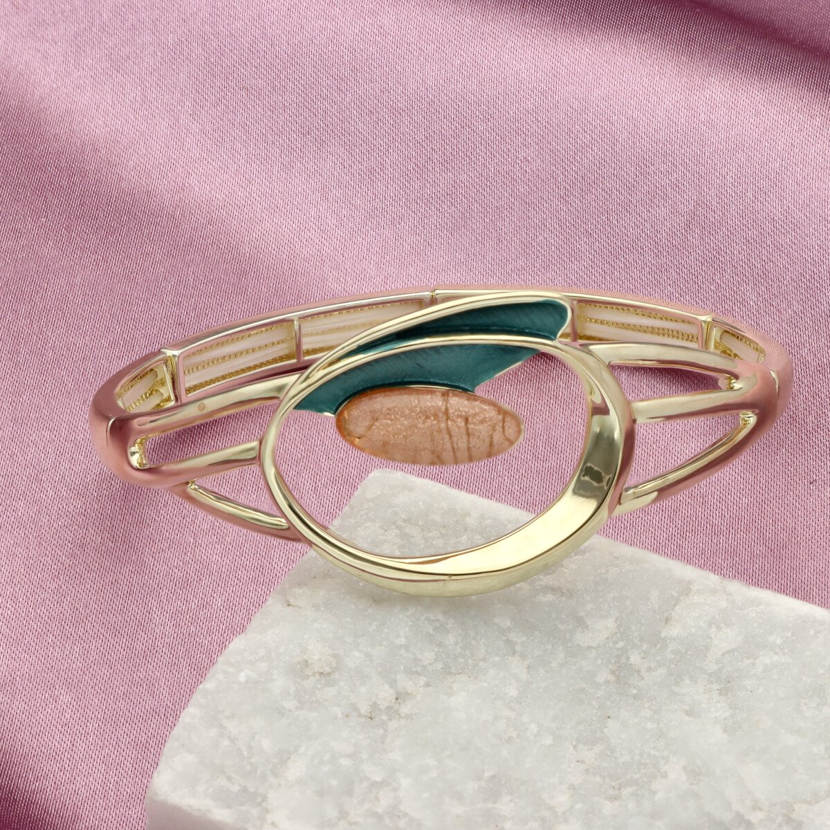 Opis produktu: Bransoletka z ozdobnym, geometrycznym motywem opartym na formie okręgu i nieregularnych elementów, wykonana na rozciągliwych gumkach, co zapewnia wygodę noszenia i dopasowanie do nadgarstka. Wykonana z hipoalergicznego metalu (zamak – stop cynku, bezpieczny dla wrażliwej skóry), ozdobiona kolorową emalią oraz żywicą z efektem głębi. Połączenie materiałów tworzy spójną i elegancką całość. Do produktu przewidzieliśmy pasujący naszyjnik i kolczyki o tym samym indeksie numerycznym.