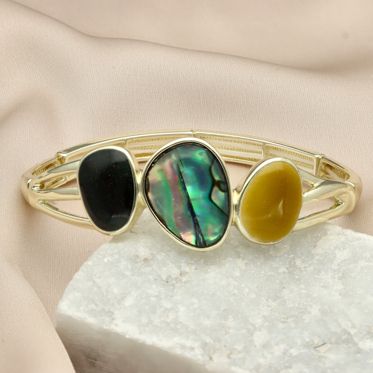 Bransoletka z ozdobnym, 3-elementowym motywem o nieregularnych, płynnych kształtach, wykonana na rozciągliwych gumkach, co zapewnia wygodę noszenia i naturalne dopasowanie do nadgarstka.