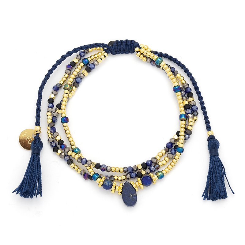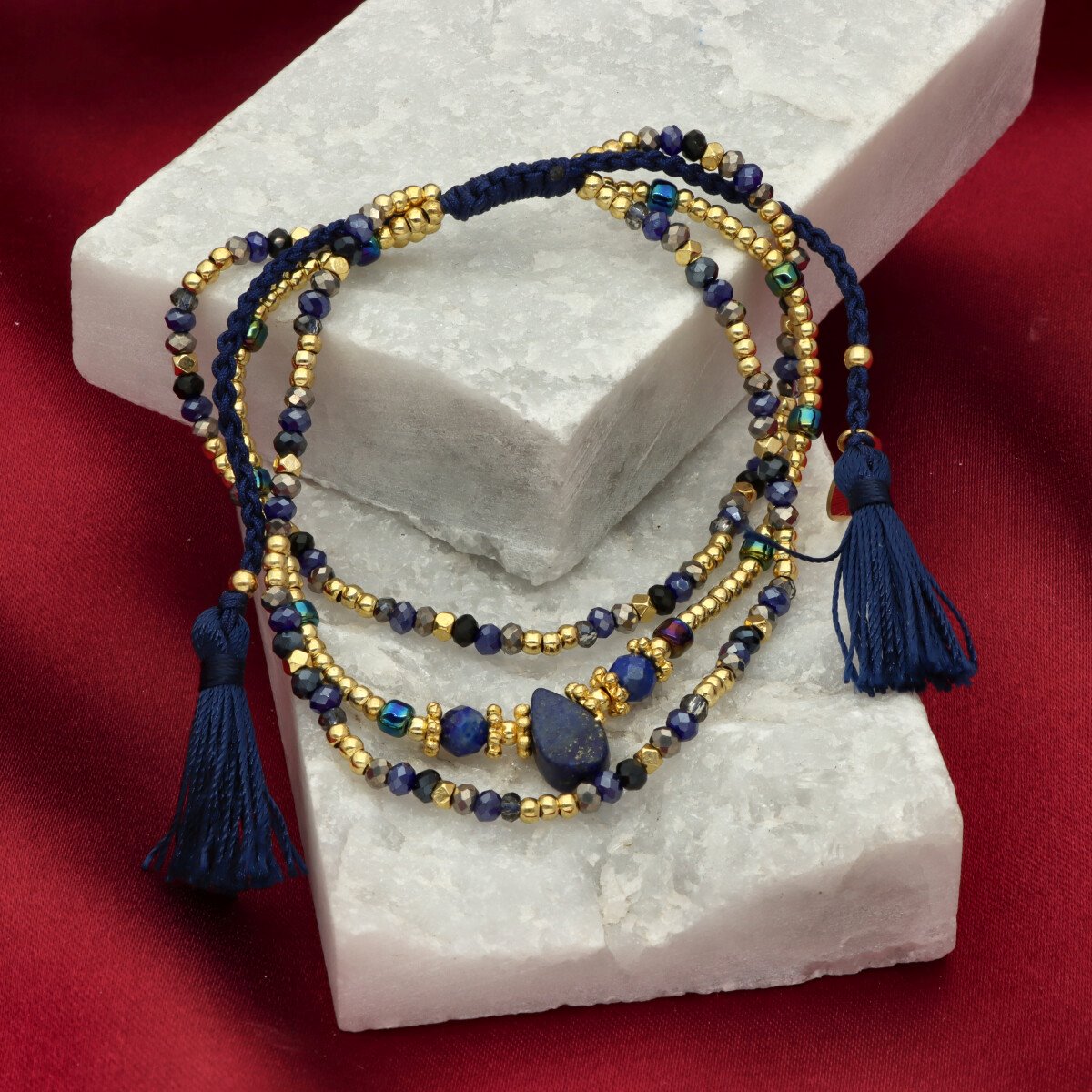 Trzyrzędowa, hipoalergiczna bransoleta wykonana z mosiądzu złoconego 16-karatowym złotem. Ozdobiona naturalnymi kamieniami i szkłem fasetowanym, które pięknie odbija światło, podkreślając strukturę biżuterii. Model posiada regulowane, zaciągane zapięcie umożliwiające dopasowanie do nadgarstka. Bransoleta łączy wysoką jakość wykonania z eleganckim, ręcznie wykończonym stylem. Zapakowana w pudełko YVON Exclusive – idealna na prezent.