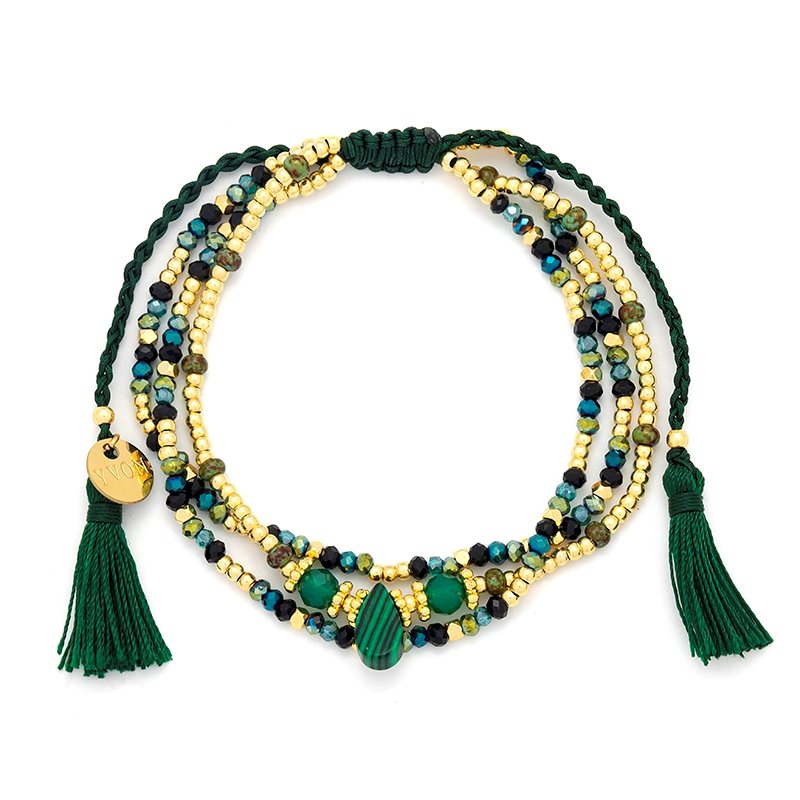 Trzyrzędowa, hipoalergiczna bransoleta wykonana z mosiądzu złoconego 16-karatowym złotem. Ozdobiona naturalnymi kamieniami i szkłem fasetowanym, które pięknie odbija światło, podkreślając strukturę biżuterii. Model posiada regulowane, zaciągane zapięcie umożliwiające dopasowanie do nadgarstka. Bransoleta łączy wysoką jakość wykonania z eleganckim, ręcznie wykończonym stylem. Zapakowana w pudełko YVON Exclusive – idealna na prezent.