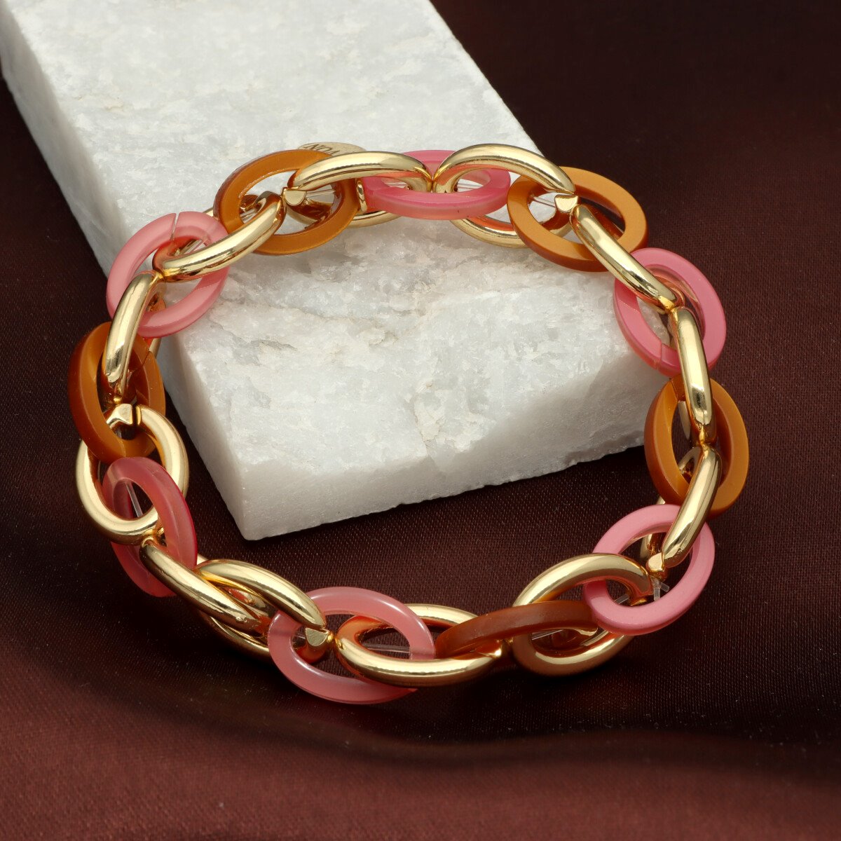 Bransoletka wykonana z wysokiej jakości zamaku (hypoalergiczny stop cynku) oraz barwionej żywicy w ciepłych odcieniach kolorów ziemi. Ogniwa o eleganckim kształcie układają się w efektowną całość, tworząc biżuterię uniwersalną i pełną nowoczesnego wdzięku. Bransoletka została osadzona na rozciągliwych żyłkach, dzięki czemu posiada rozmiar uniwersalny, wygodnie dopasowując się do nadgarstka.