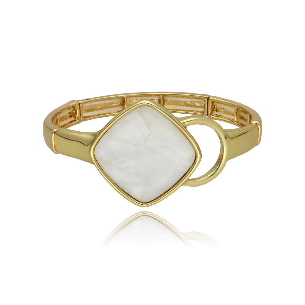 Stylowa bransoletka na elastycznej gumce, wykonana z metalowych, antyalergicznych elementów i muszli naturalnej mlecznej.