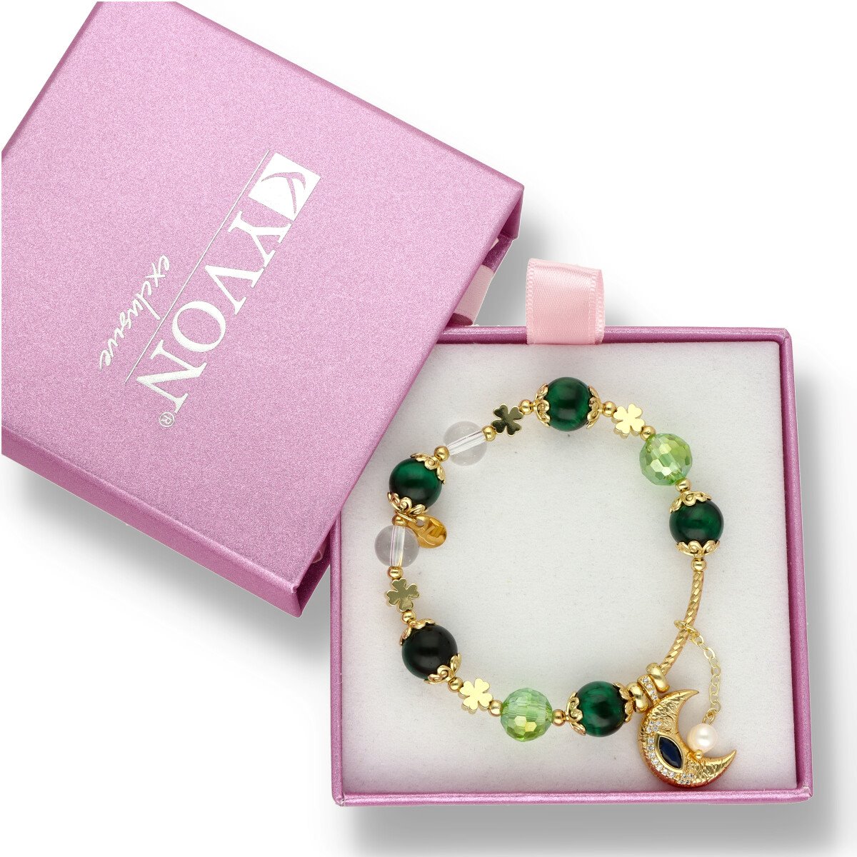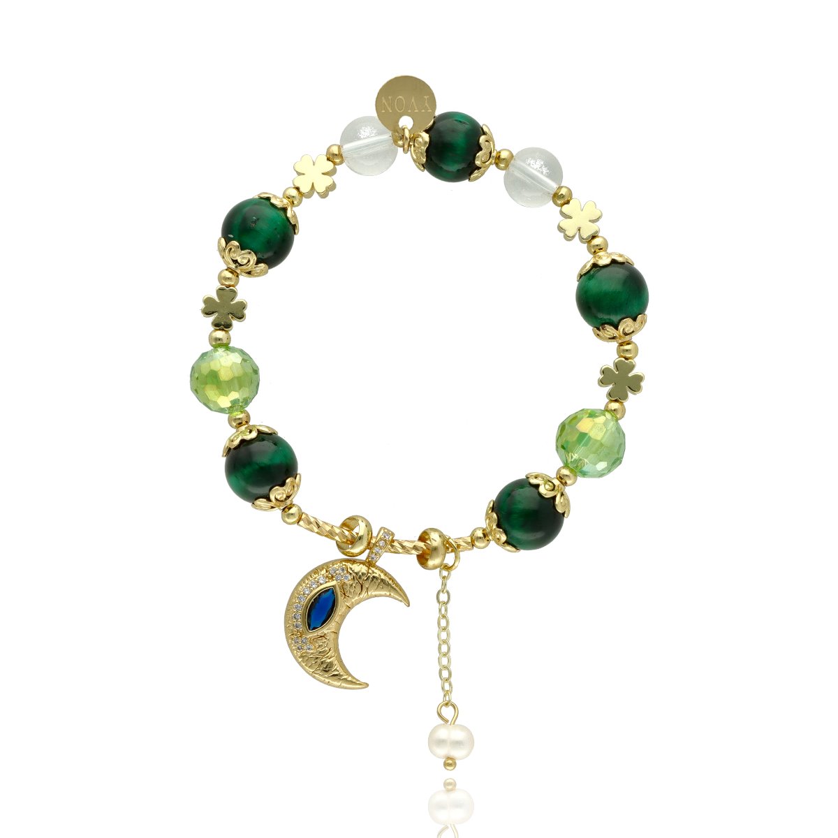 Ekskluzywna bransoletka z kolekcji LOVELY STONES wykonana z najwyższej jakości mosiądzu, zielonego tygrysiego oka, pereł, kryształu górskiego.