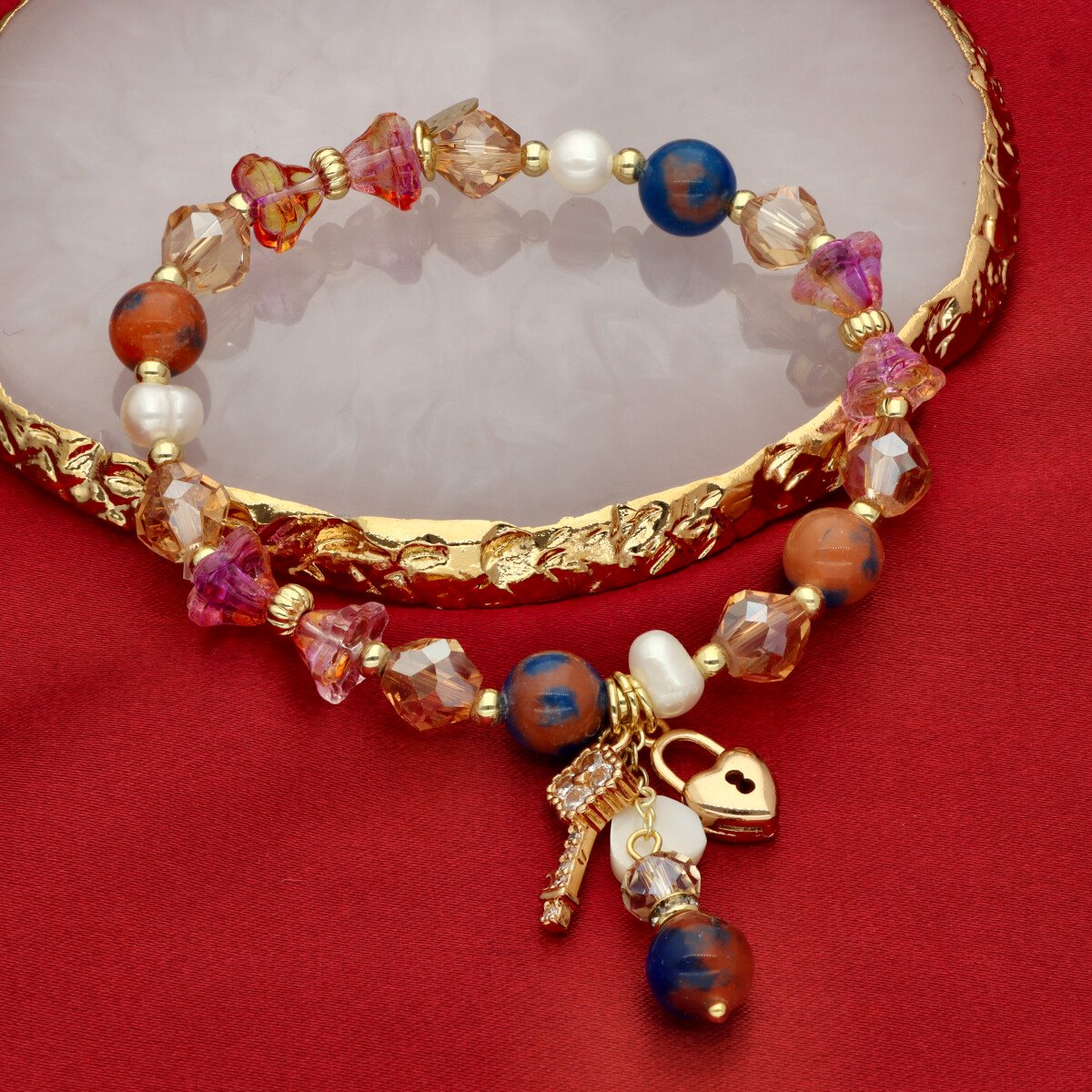 Ekskluzywna bransoletka z kolekcji LOVELY STONES wykonana z najwyższej jakości mosiądzu, agatu, pereł naturalnych, cyrkonii.
