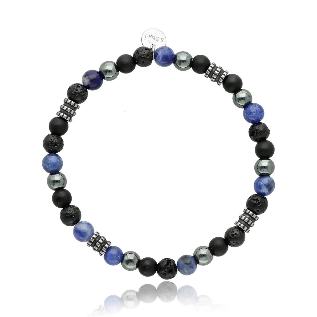 Bransoletka męska YVES wykonana z naturalnych kamieni (lapis Lazuri, lawa, agat, hematyt) zestawionych ze stalą szlachetną. Osadzona na wytrzymałych, elastycznych gumkach, dzięki czemu dopasowuje się do każdego nadgarstka. W pełni antyalergiczna, komfortowa w noszeniu. Bransoletka pakowana w eleganckie pudełko, idealna zarówno na co dzień, jak i w formie prezentu. Stanowi komplet z naszyjnikiem o tym samym indeksie.