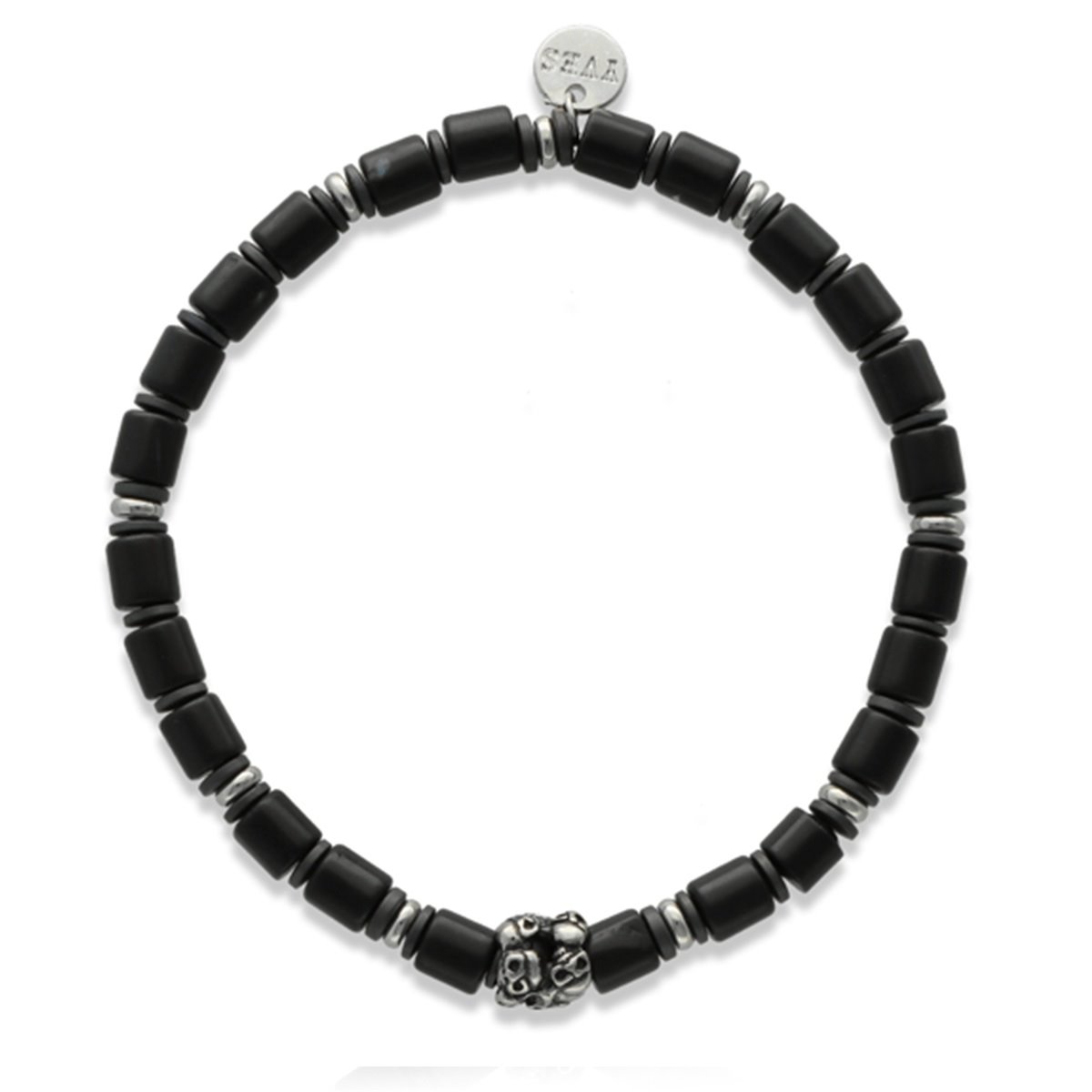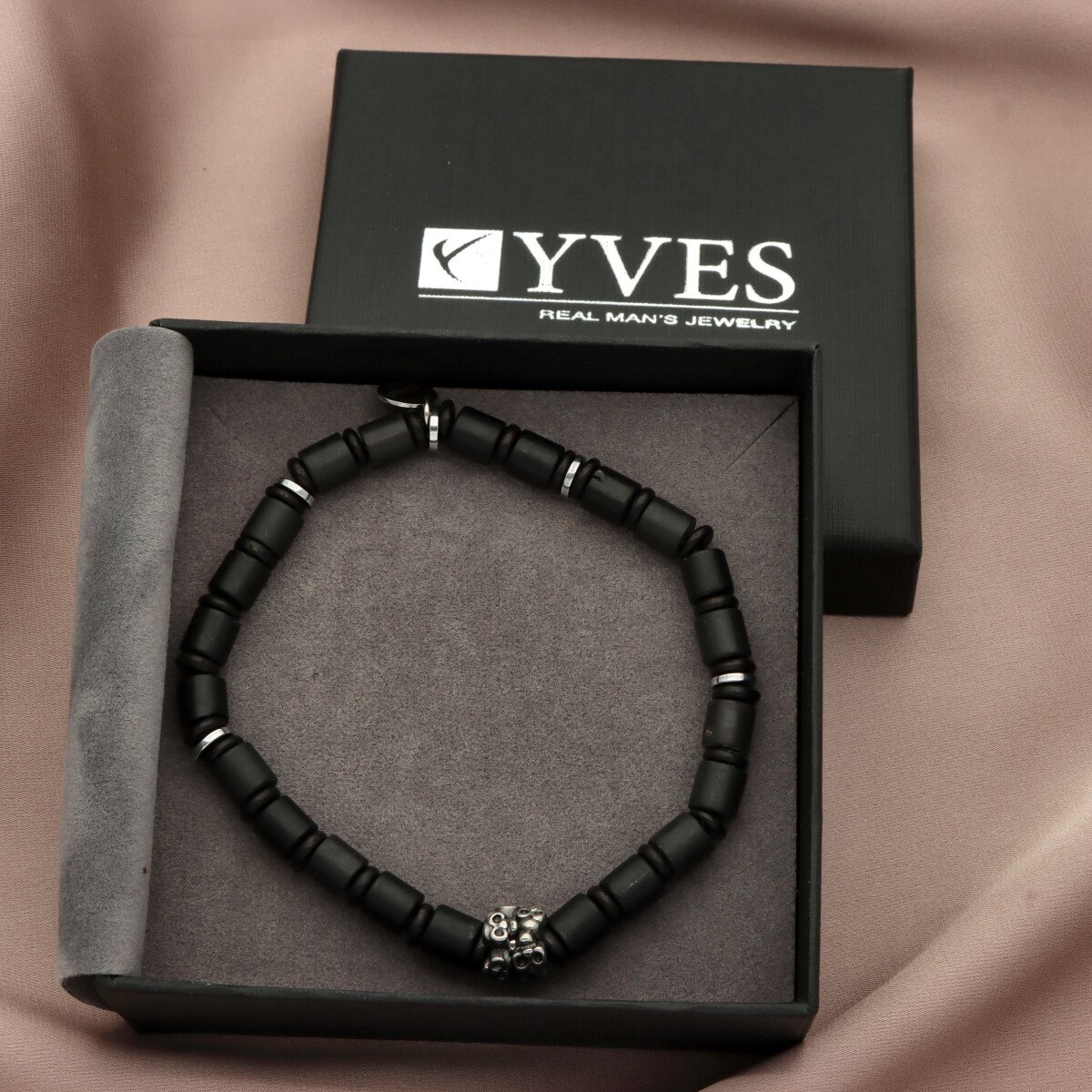 Bransoletka męska YVES wykonana z naturalnych kamieni (agat czarny) zestawionych ze stalą szlachetną. Osadzona na wytrzymałych, elastycznych gumkach, dzięki czemu dopasowuje się do każdego nadgarstka. W pełni antyalergiczna, komfortowa w noszeniu. Bransoletka pakowana w eleganckie pudełko, idealna zarówno na co dzień, jak i w formie prezentu. Stanowi komplet z naszyjnikiem o tym samym indeksie.