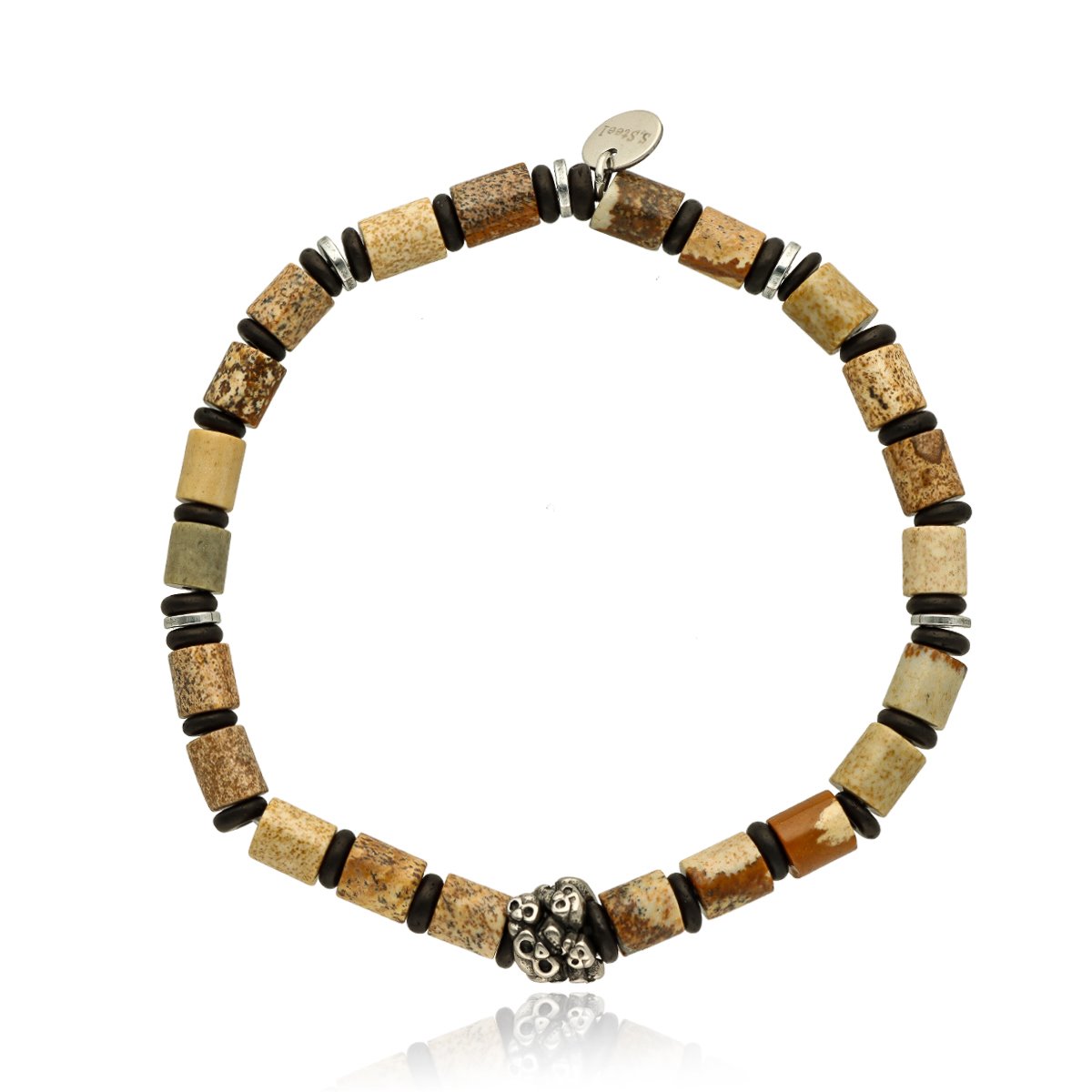 Bransoletka męska YVES wykonana z naturalnych kamieni (jaspis obrazkowy) zestawionych ze stalą szlachetną. Osadzona na wytrzymałych, elastycznych gumkach, dzięki czemu dopasowuje się do każdego nadgarstka. W pełni antyalergiczna, komfortowa w noszeniu. Bransoletka pakowana w eleganckie pudełko, idealna zarówno na co dzień, jak i w formie prezentu. Stanowi komplet z naszyjnikiem o tym samym indeksie.