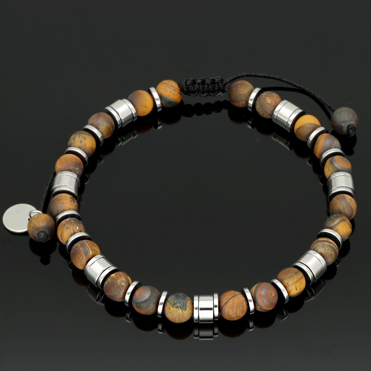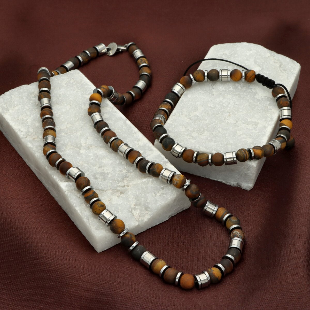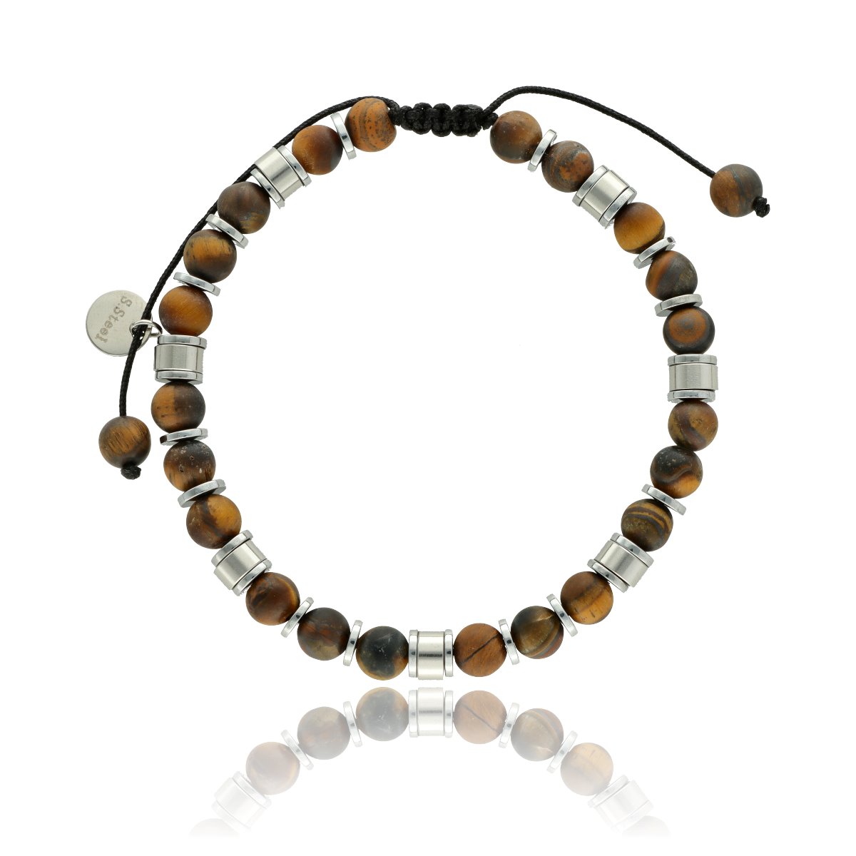Bransoletka męska YVES wykonana z naturalnych kamieni – tiger eye – zestawionych ze stalą szlachetną. Osadzona na wytrzymałych, elastycznych gumkach, dzięki czemu dopasowuje się do każdego nadgarstka. W pełni antyalergiczna, komfortowa w noszeniu. Bransoletka pakowana w eleganckie pudełko, idealna zarówno na co dzień, jak i w formie prezentu. Stanowi komplet z naszyjnikiem o tym samym indeksie.