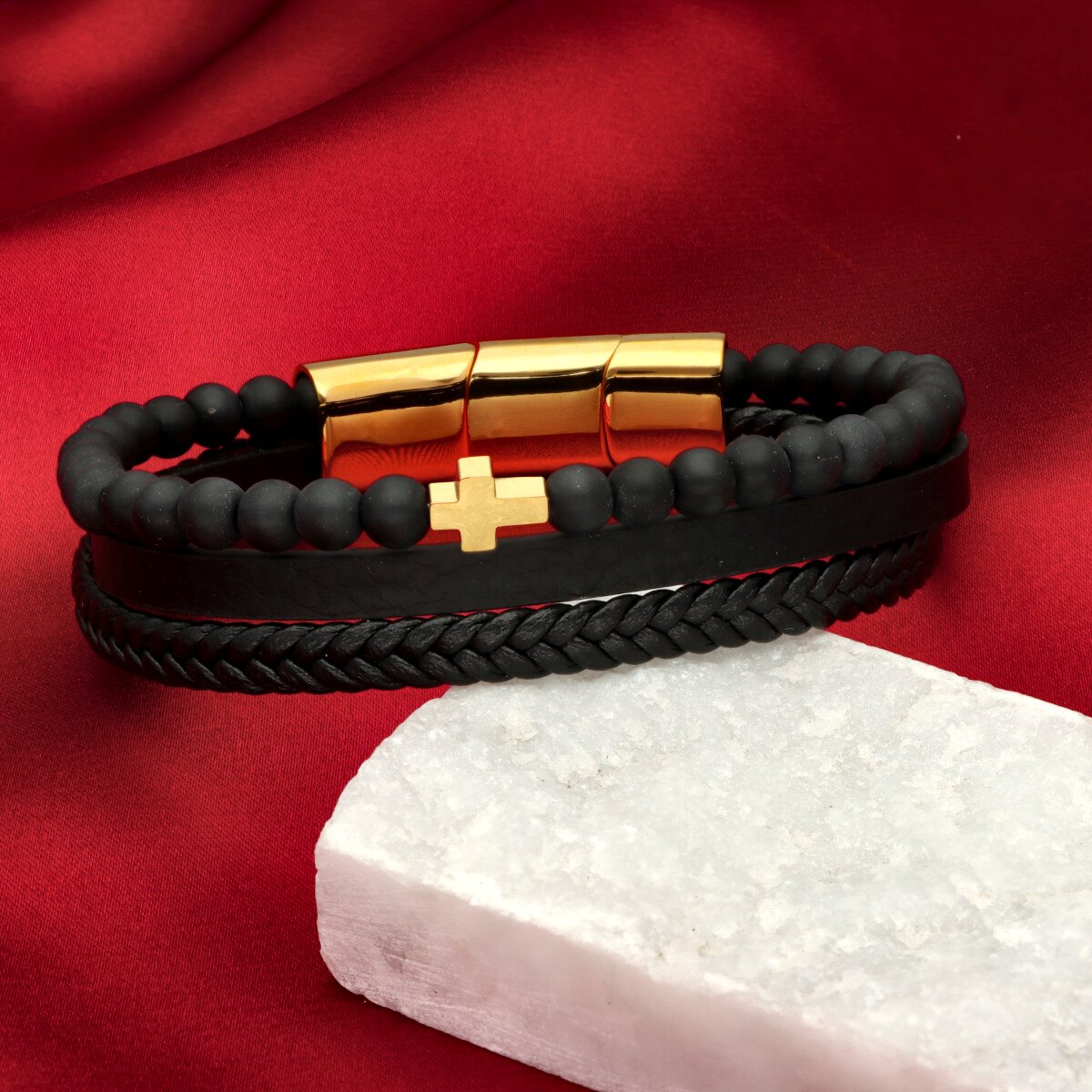 Męska bransoleta wykonana z naturalnej skóry, kamieni LAWA oraz stali szlachetnej 316L, odpornej na uszkodzenia i hipoalergicznej. Prosty, nowoczesny design sprawia, że pasuje zarówno na co dzień, jak i do bardziej eleganckich stylizacji.