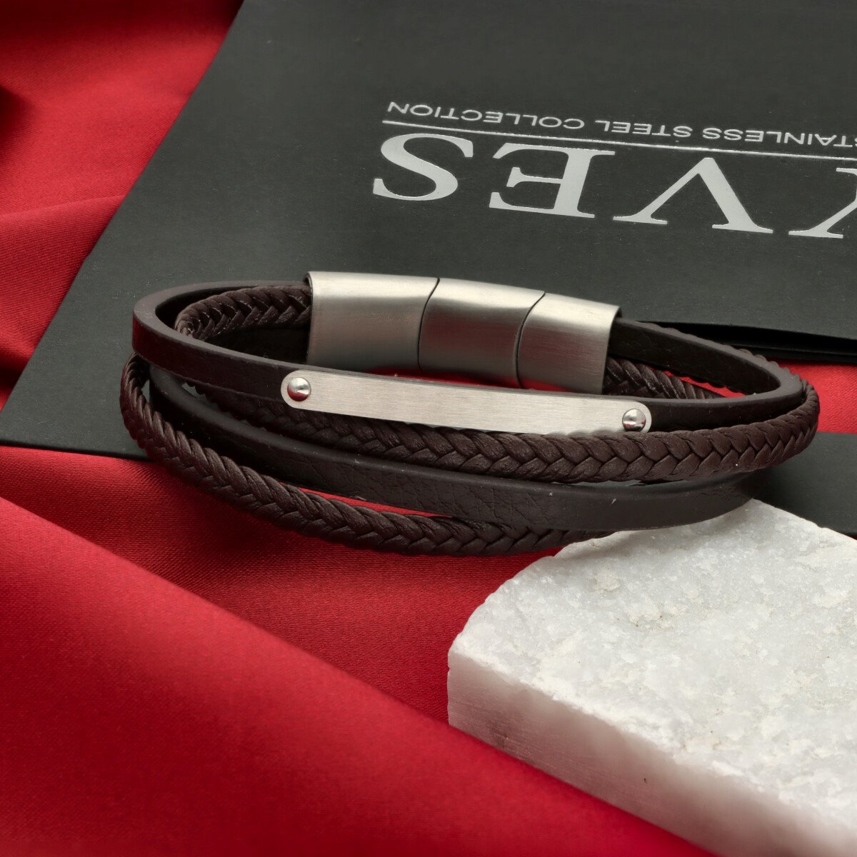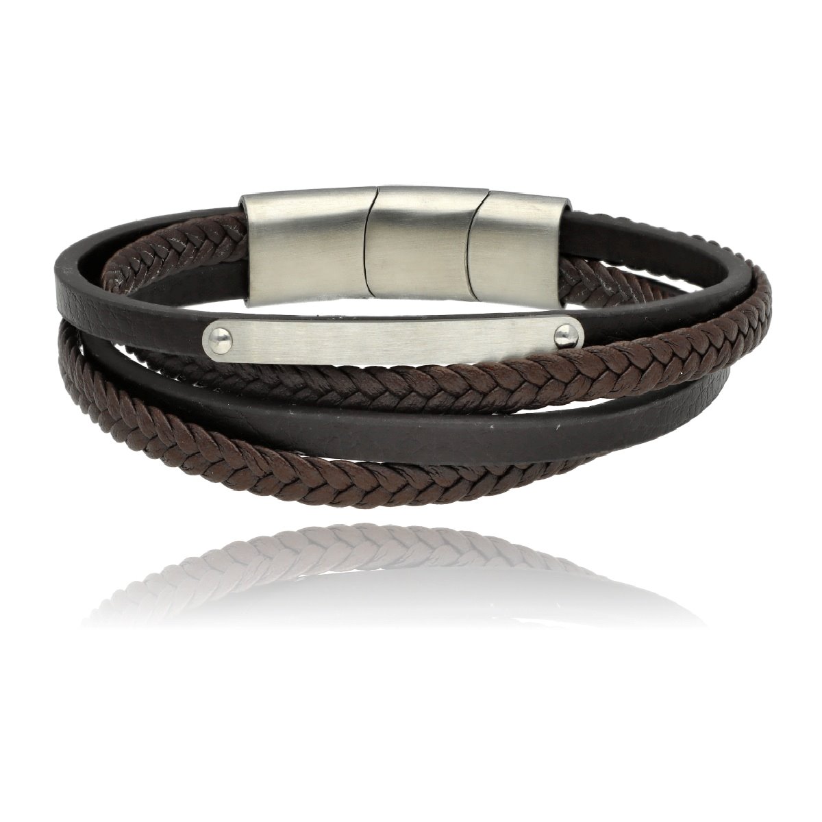 Męska bransoleta wykonana z naturalnej skóry oraz stali szlachetnej 316L, odpornej na uszkodzenia i hipoalergicznej. Prosty, nowoczesny design sprawia, że pasuje zarówno na co dzień, jak i do bardziej eleganckich stylizacji.