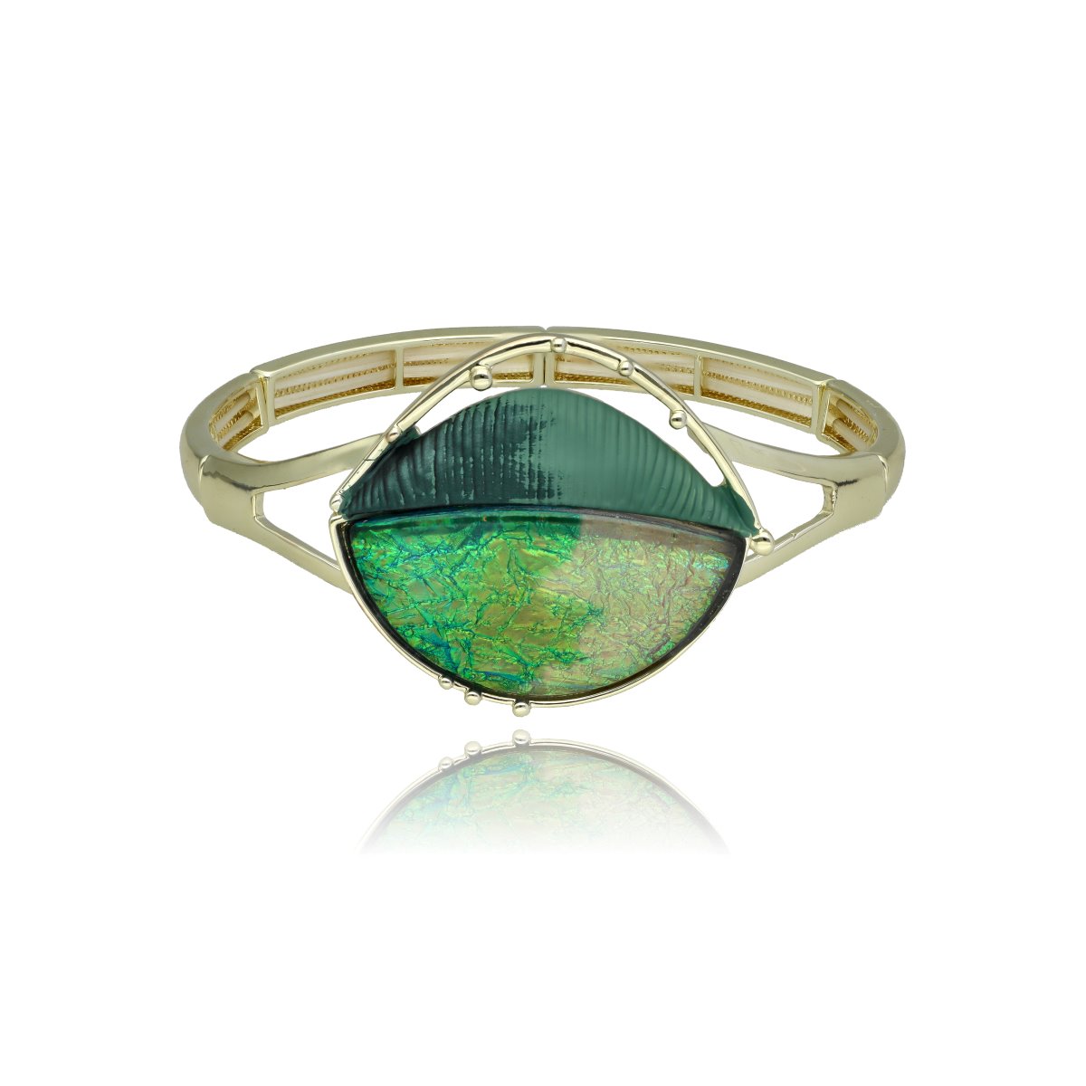 Bransoletka z ozdobnym motywem o nowoczesnej, geometrycznej formie, wykonana na rozciągliwych gumkach, co zapewnia wygodę noszenia i łatwe dopasowanie do nadgarstka.