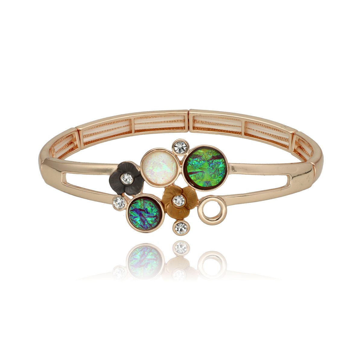 Elegancka bransoletka wykonana z metalu, żywicy jubilerskiej i emalii. Rozmiar uniwersalny (na rozciągliwych gumkach). Szukaj do kompletu naszyjnika i kolczyków o tym samym indeksie numerycznym.