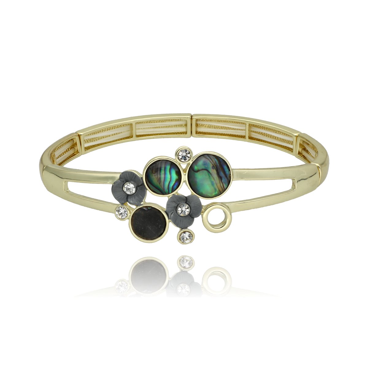 Elegancka bransoletka wykonana z metalu, żywicy jubilerskiej i emalii. Rozmiar uniwersalny (na rozciągliwych gumkach). Szukaj do kompletu naszyjnika i kolczyków o tym samym indeksie numerycznym.