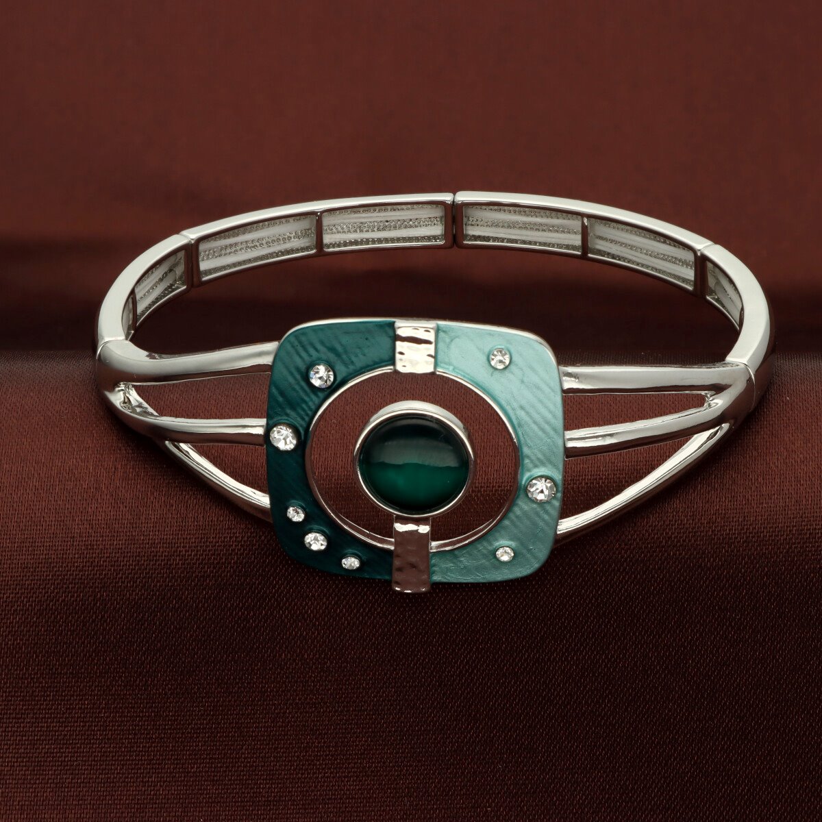 Elegancka bransoletka wykonana z metalu antyalergicznego, kwarcu i emalii. Rozmiar uniwersalny (na rozciągliwych gumkach). Szukaj do kompletu naszyjnika i kolczyków o tym samym indeksie numerycznym.