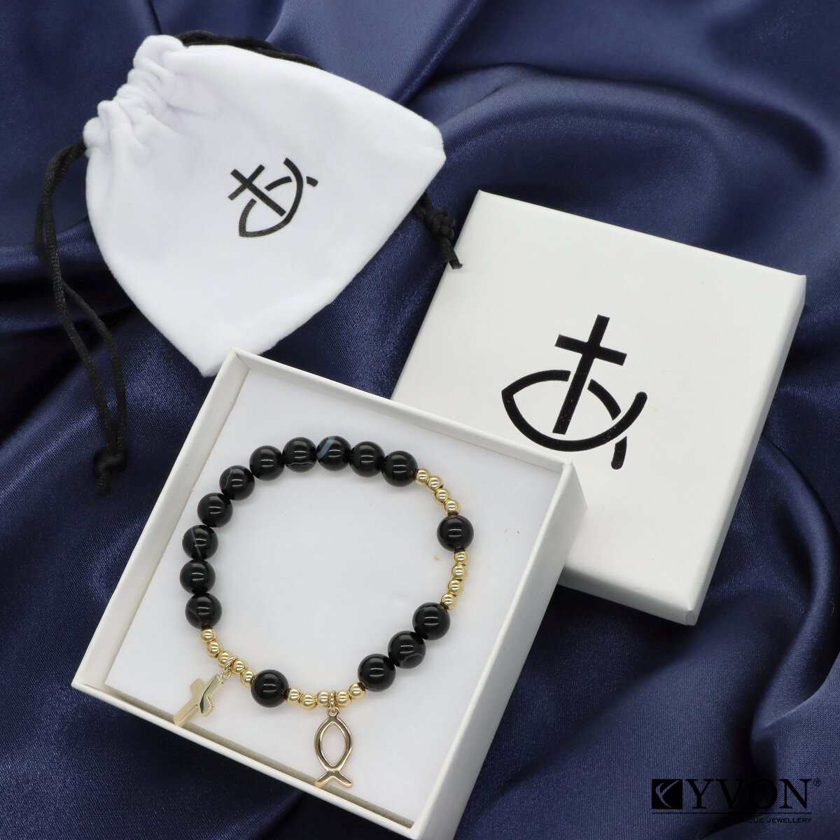Idealny pomysł na prezent na Komunię Świętą. Różaniec - bransoletka z kamieni naturalnych, w eleganckim pudełeczku, w zestawie z sakiewką do przechowywania.