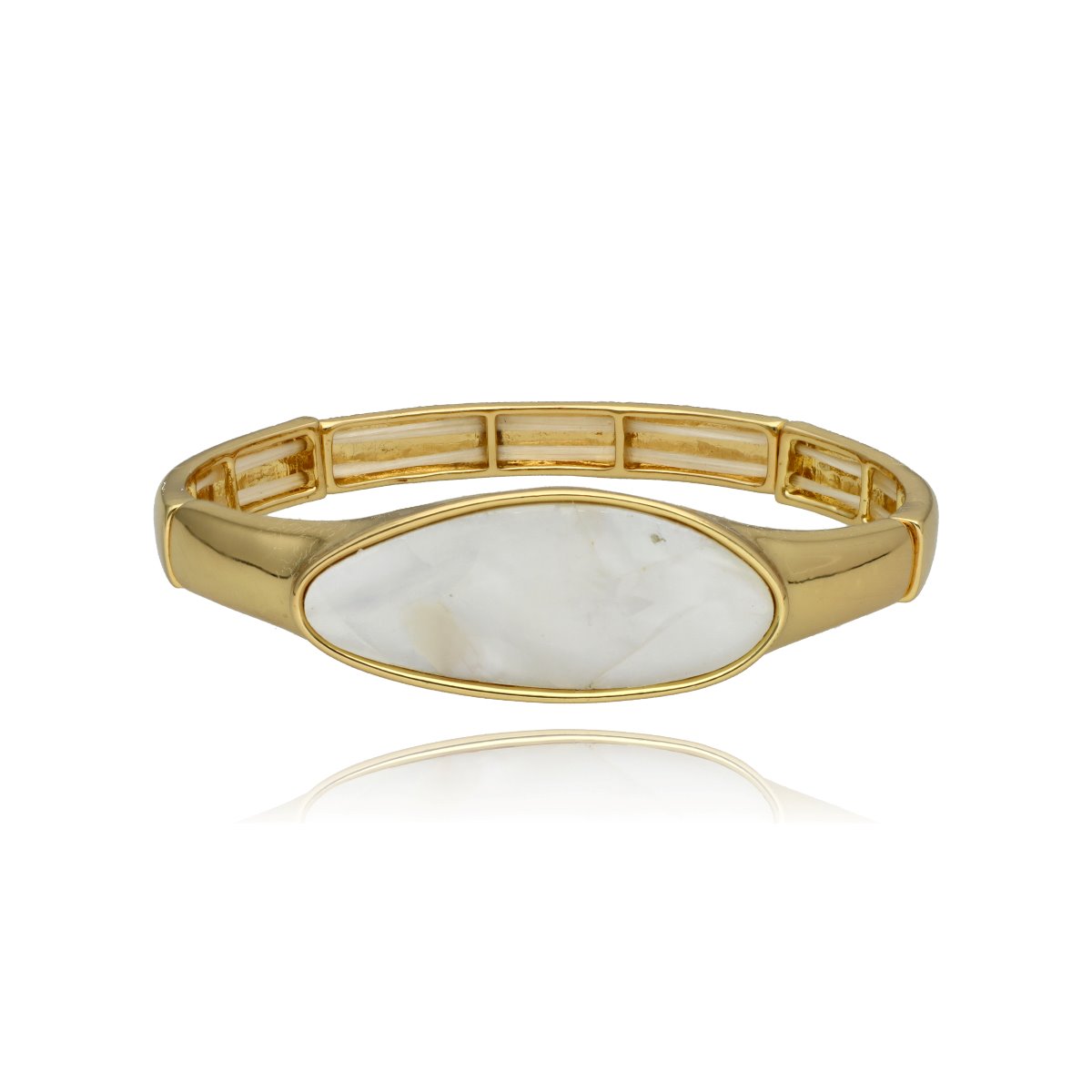 Stylowa bransoletka na elastycznej gumce, wykonana z metalowych, antyalergicznych elementów i muszli naturalnej mlecznej.