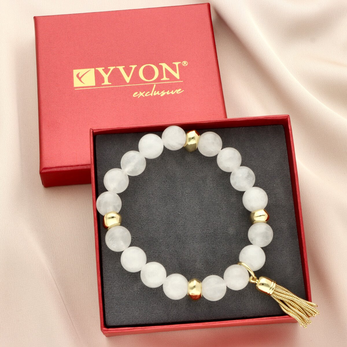 Stylowa bransoletka z naturalnym kamieniem jadeit mleczny to eleganckie uzupełnienie zestawu. Gładko szlifowane kamienie o mleczno-białym odcieniu z delikatnym, woskowym połyskiem tworzą spójną i ponadczasową kompozycję.