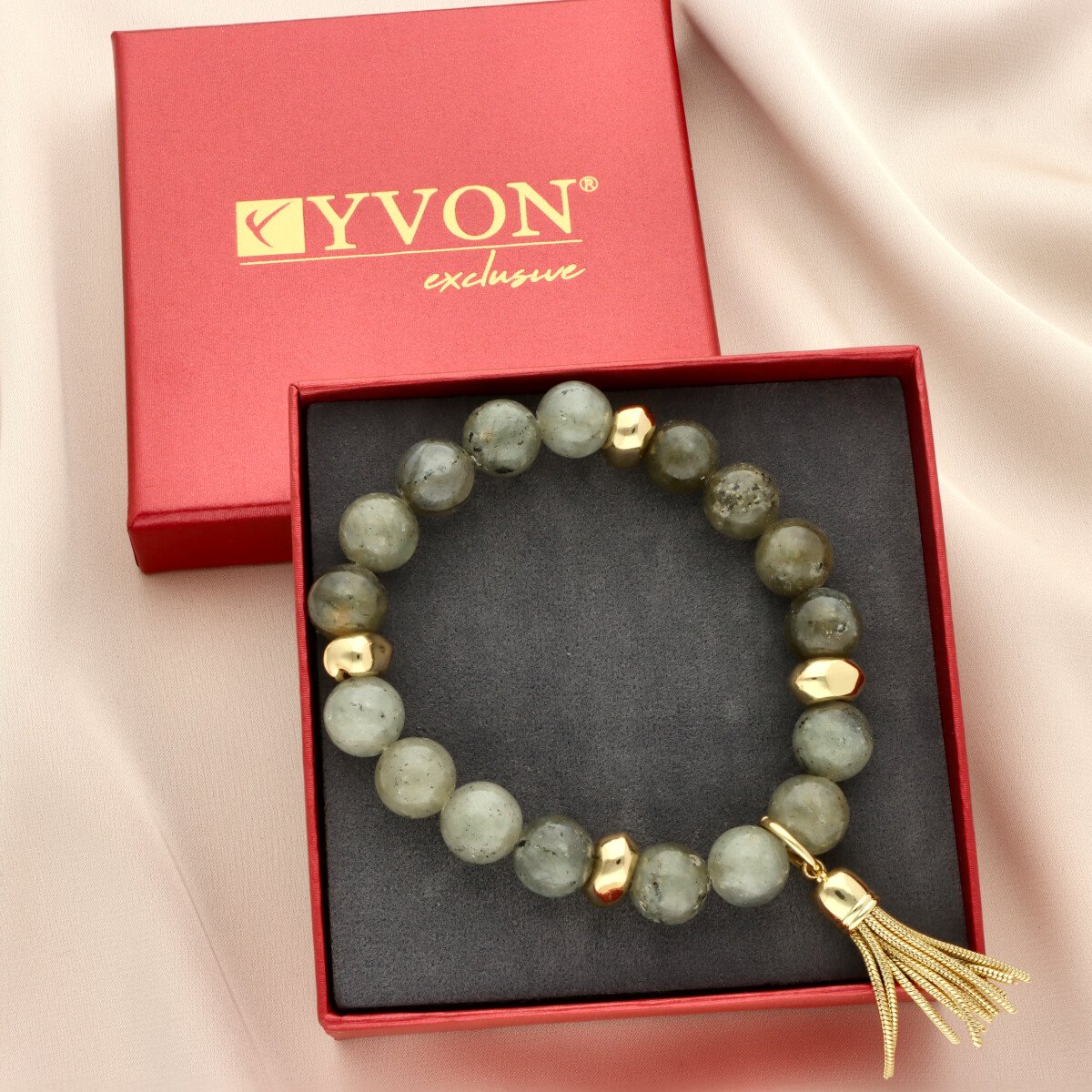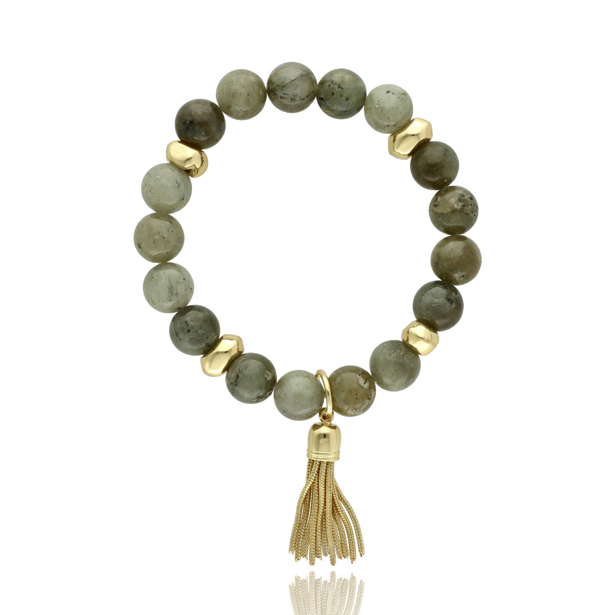 Stylowa bransoletka z naturalnym kamieniem labradoryt to eleganckie uzupełnienie zestawu. Gładko szlifowane kamienie o szaro-zielonym odcieniu z delikatnym efektem refleksów tworzą spójną i ponadczasową kompozycję.