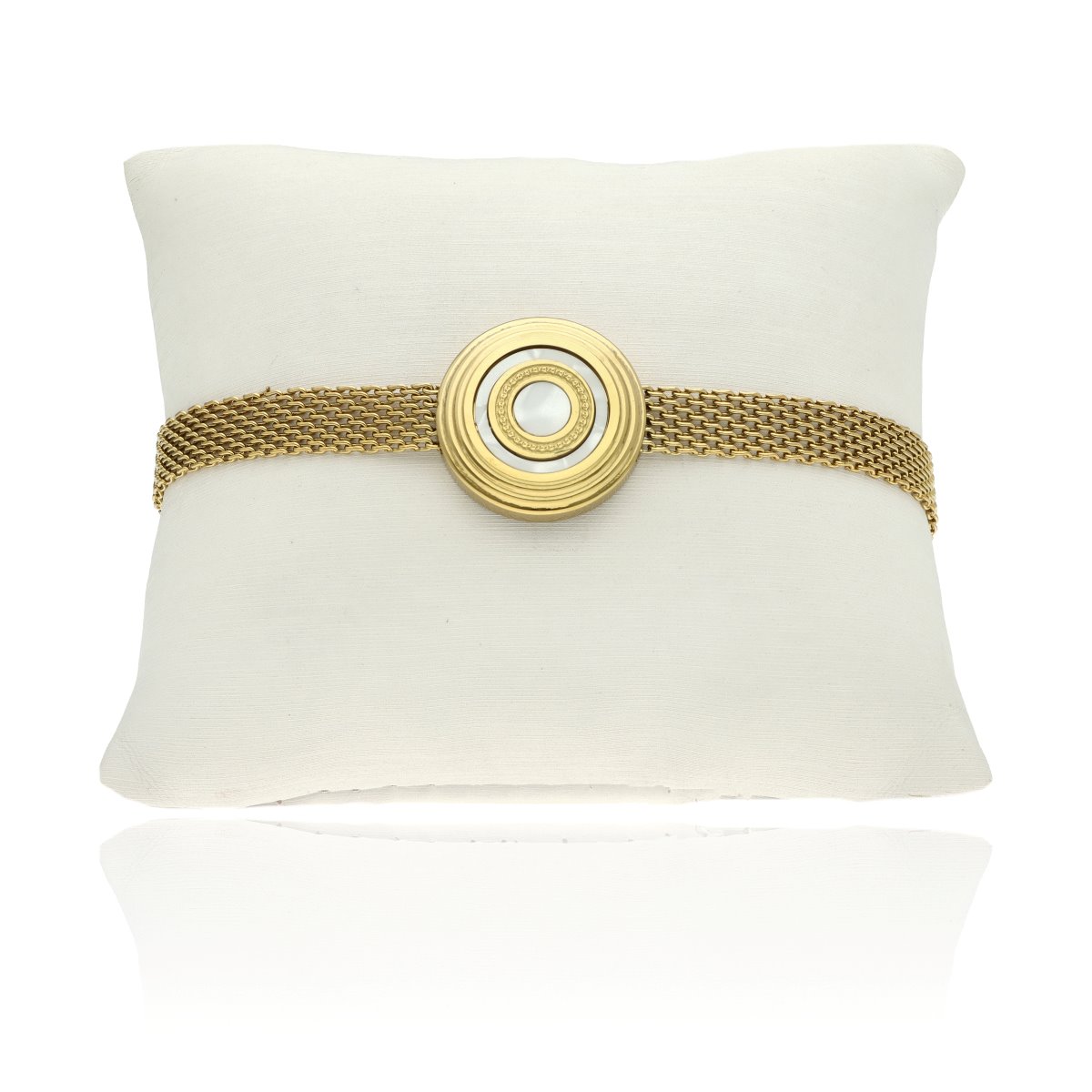 Szeroka plecionka o długości 17 cm + 5 cm regulacji zakończona jest karabińczykiem i centralnym elementem ozdobnym o średnicy 2 cm. Każda bransoletka pakowana jest w eleganckie pudełko YVON.