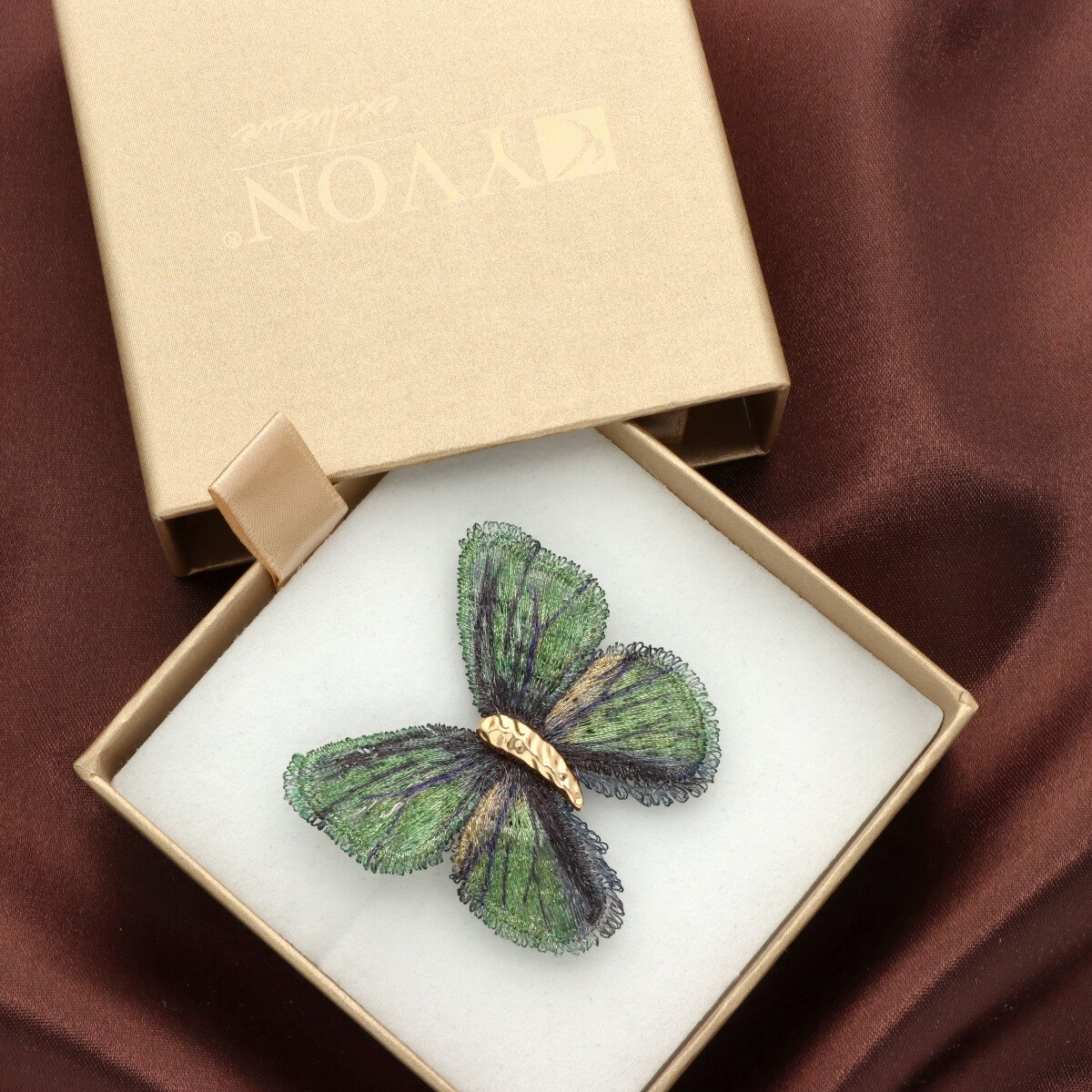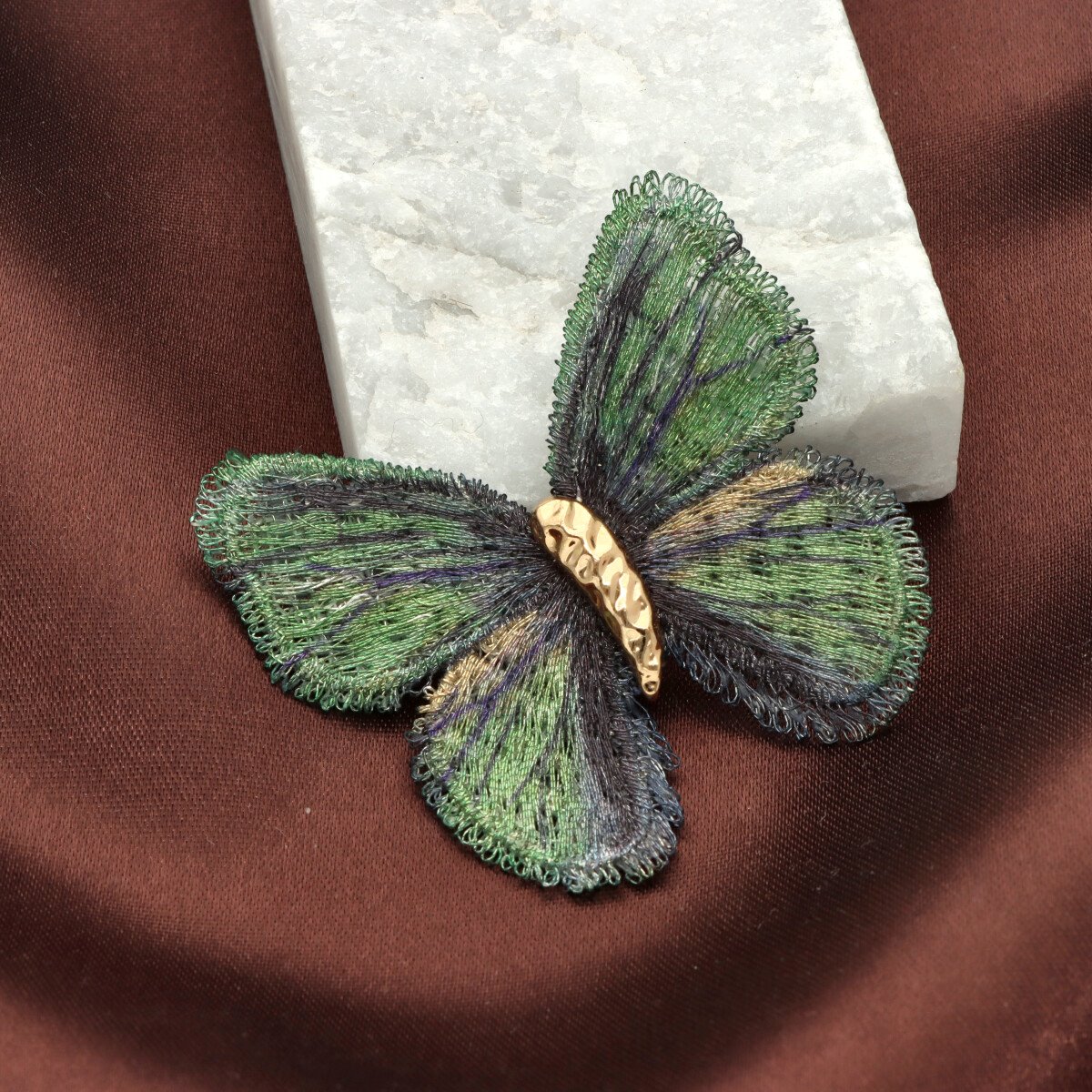 Elegancka broszka w kształcie motyla, wykonana z wyjątkową dbałością o detale. Misternie uformowane skrzydła mają strukturę przypominającą delikatny haft lub ręcznie plecione włókna, dzięki czemu całość wygląda lekko, a zarazem bardzo efektownie. Subtelne przejścia kolorystyczne nadają broszce głębi i sprawiają, że pięknie mieni się przy każdym ruchu.