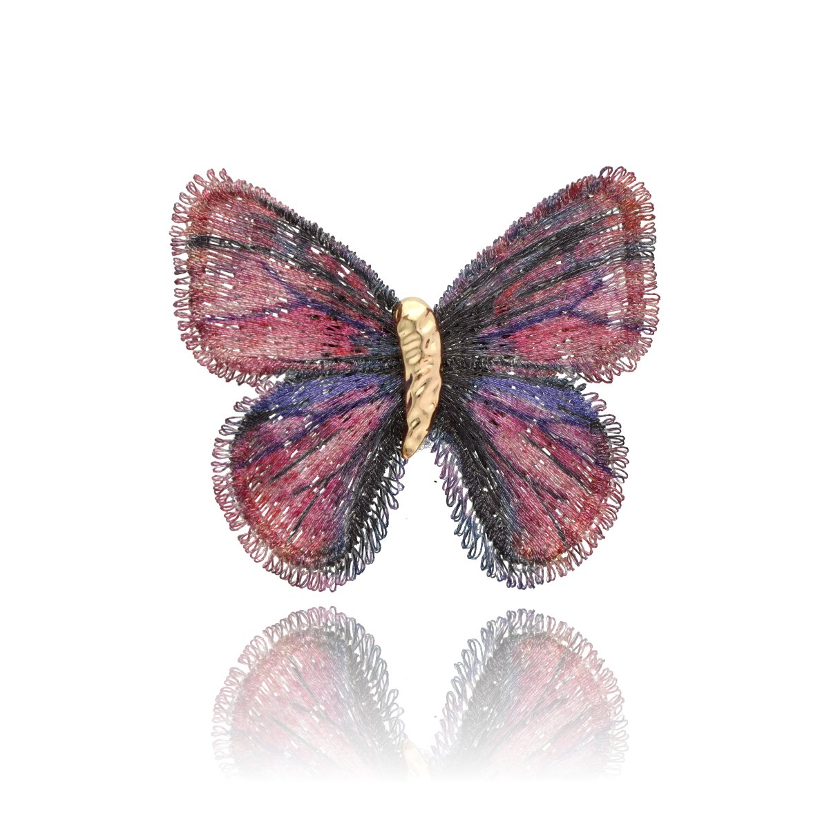 Elegancka broszka w kształcie motyla, wykonana z wyjątkową dbałością o detale. Misternie uformowane skrzydła mają strukturę przypominającą delikatny haft lub ręcznie plecione włókna, dzięki czemu całość wygląda lekko, a zarazem bardzo efektownie. Subtelne przejścia kolorystyczne nadają broszce głębi i sprawiają, że pięknie mieni się przy każdym ruchu.