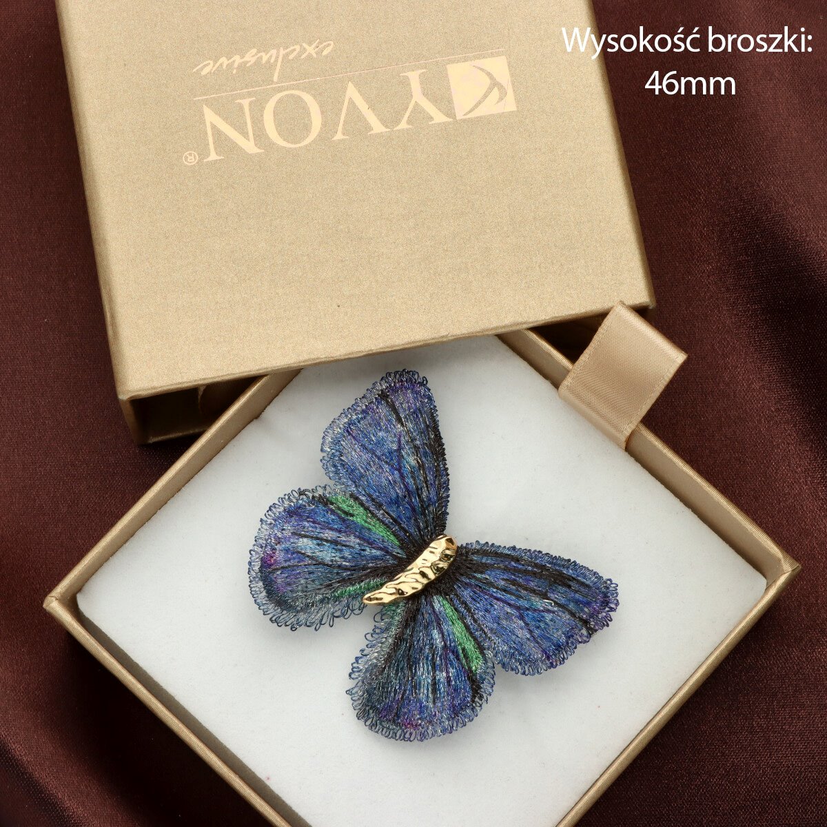 Elegancka broszka w kształcie motyla, wykonana z wyjątkową dbałością o detale. Misternie uformowane skrzydła mają strukturę przypominającą delikatny haft lub ręcznie plecione włókna, dzięki czemu całość wygląda lekko, a zarazem bardzo efektownie. Subtelne przejścia kolorystyczne nadają broszce głębi i sprawiają, że pięknie mieni się przy każdym ruchu.