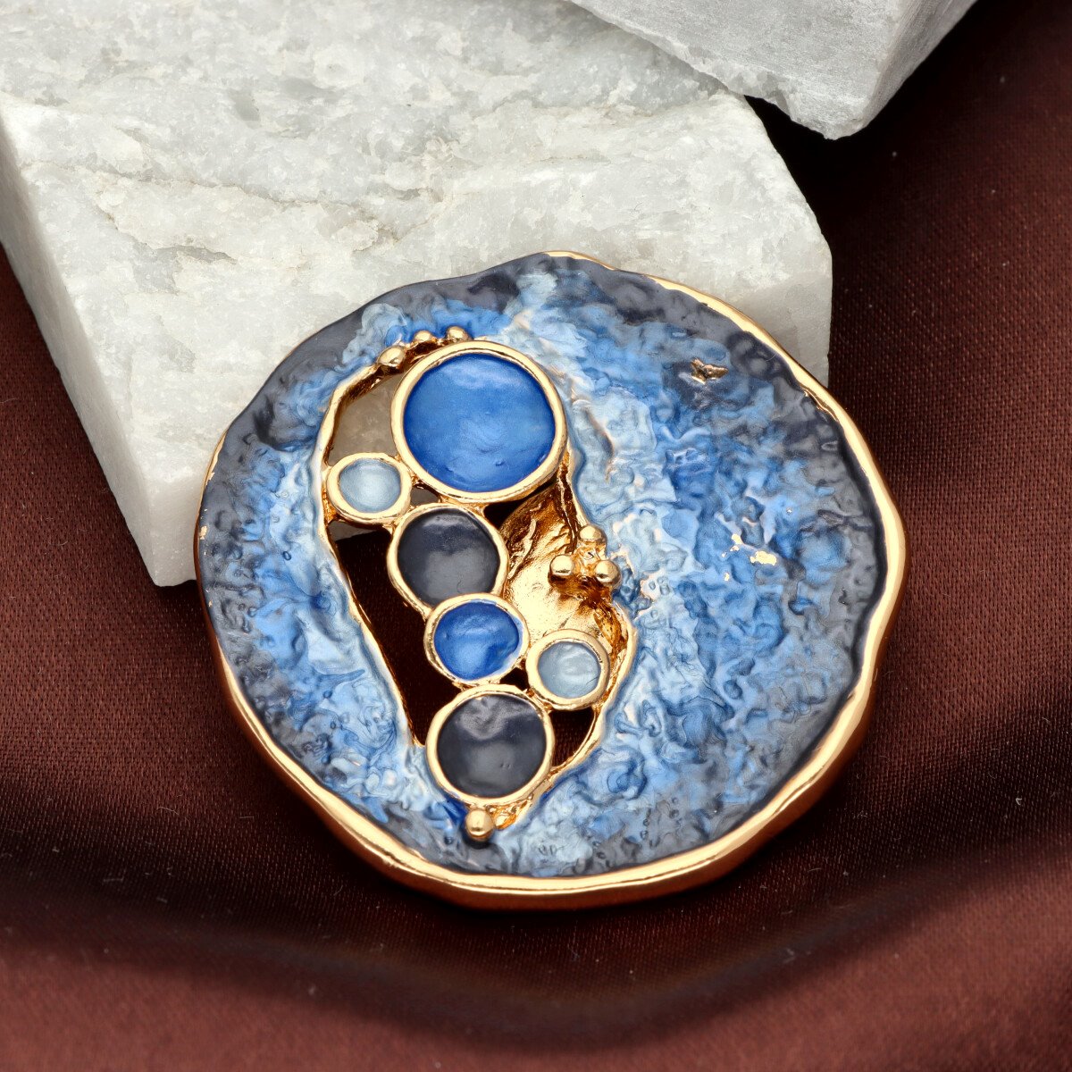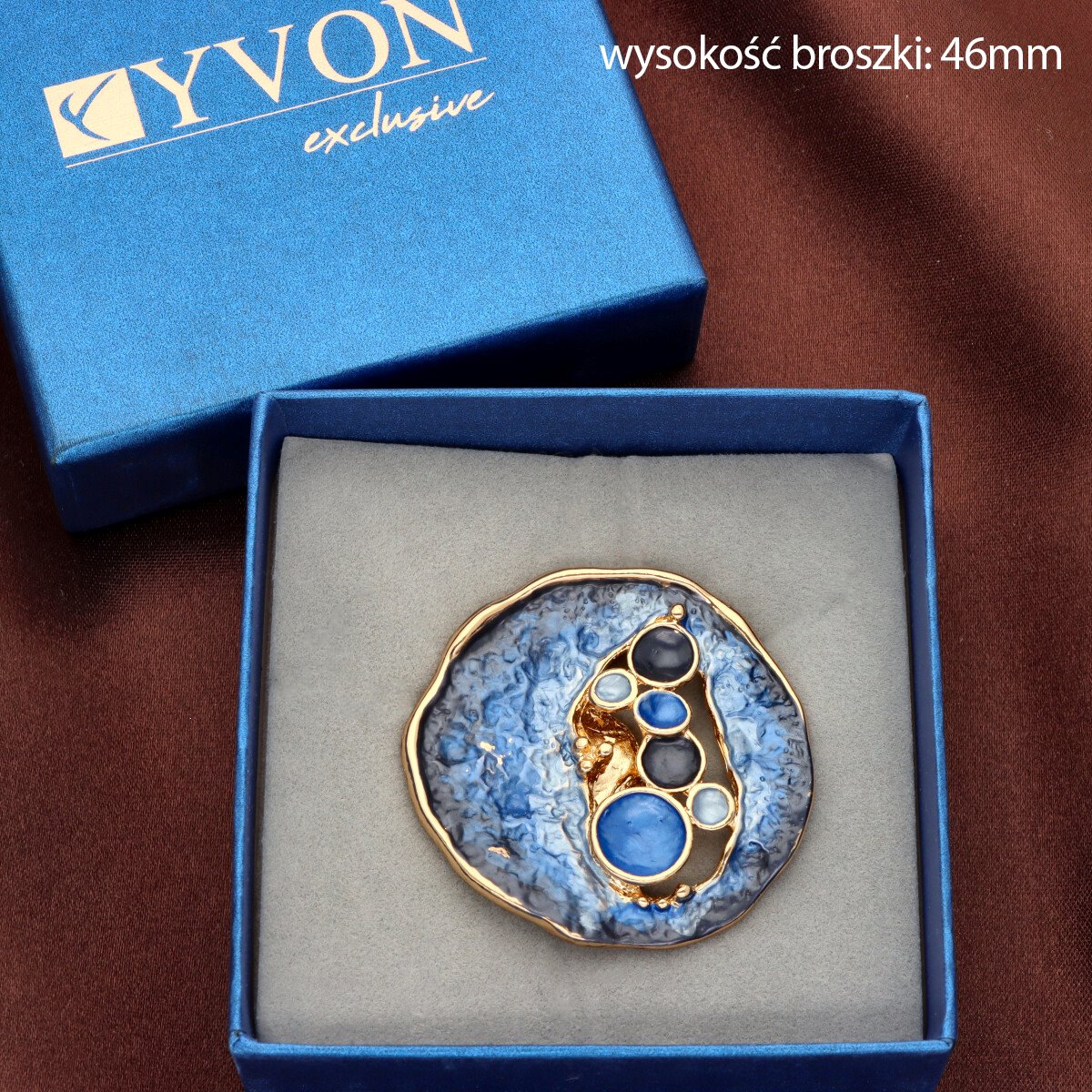 Broszka na magnes z kolekcji YVON biżuteria artystyczna, wykonana z metalu hipoalergicznego i zdobiona ręcznie nanoszoną emalią. Średnica broszki ok. 5 cm. Mocny magnes umożliwia przypięcie bez ryzyka uszkodzenia tkaniny – idealna do płaszczy, szali i torebek. Każdy egzemplarz pakowany jest w eleganckie pudełko prezentowe YVON.
