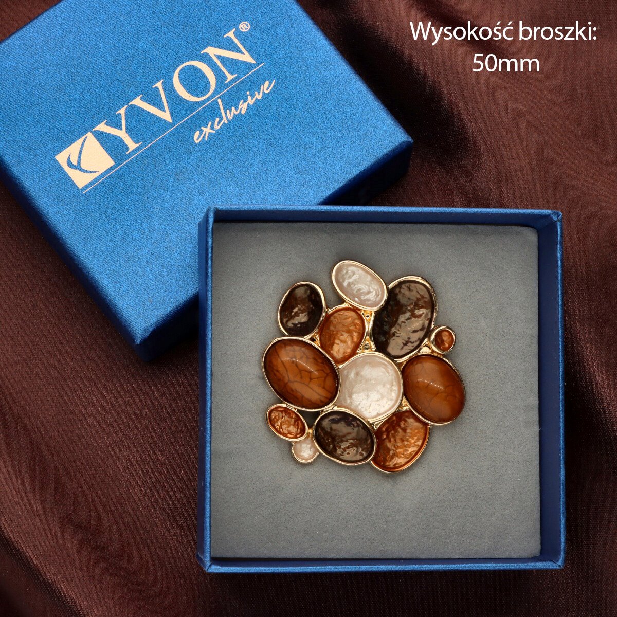 Broszka na magnes z kolekcji YVON biżuteria artystyczna, wykonana z metalu hipoalergicznego i zdobiona ręcznie nanoszoną emalią. Średnica broszki ok. 5 cm. Mocny magnes umożliwia przypięcie bez ryzyka uszkodzenia tkaniny – idealna do płaszczy, szali i torebek. Każdy egzemplarz pakowany jest w eleganckie pudełko prezentowe YVON.