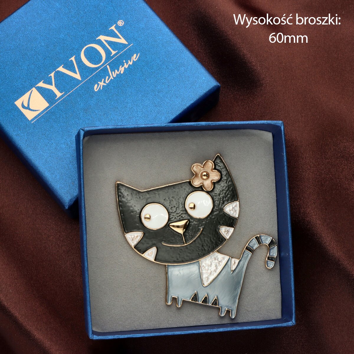 Broszka na magnes z kolekcji YVON biżuteria artystyczna, wykonana z metalu hipoalergicznego i zdobiona ręcznie nanoszoną emalią. Średnica broszki ok. 5 cm. Mocny magnes umożliwia przypięcie bez ryzyka uszkodzenia tkaniny – idealna do płaszczy, szali i torebek. Każdy egzemplarz pakowany jest w eleganckie pudełko prezentowe YVON.