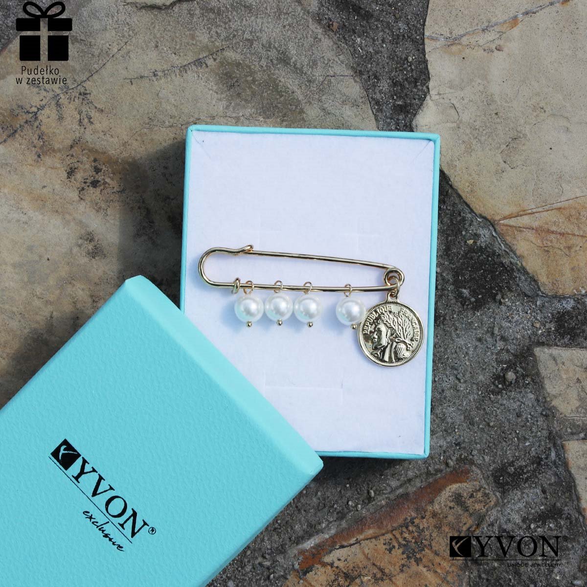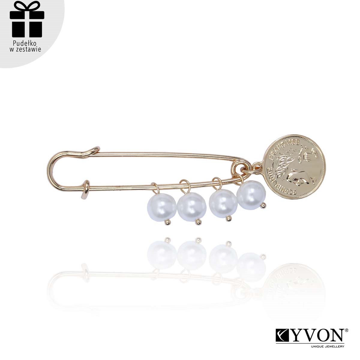 BROSZKA - AGRAFKA z pozłacanego mosiadzu i szklanej perły. Z najnowszej linii YVON EXCLUSIVE. Długosć ok. 6 cm. Produkt w 100% antyalergiczny. W ekskluzywnym pudełku.