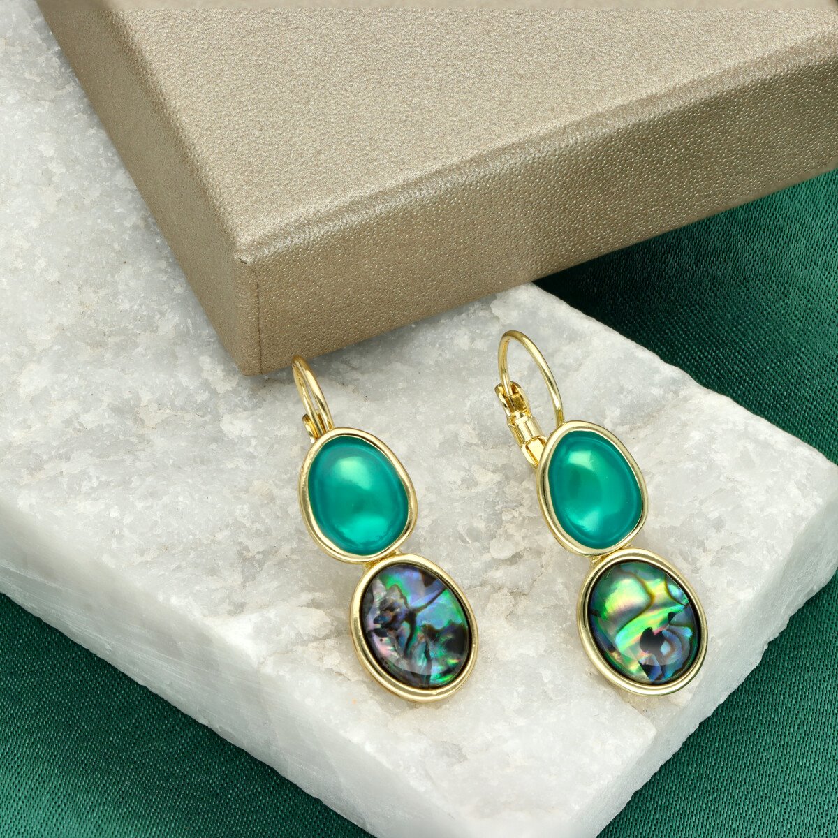 Kolczyki z żywicy, emalii i muszli abalone – długość ok. 3 cm Eleganckie kolczyki wykonane z wysokiej jakości metalu antyalergicznego, zdobione kolorową żywicą, emalią oraz naturalną muszlą abalone. Ich subtelna długość (ok. 3 cm) sprawia, że są idealnym wyborem do codziennych i wieczorowych stylizacji. Delikatne, ale wyraziste – stanowią doskonałe uzupełnienie kompletu z pierścionkiem, bransoletką i naszyjnikiem o tym samym indeksie. Zapakowane w eleganckie pudełczko.