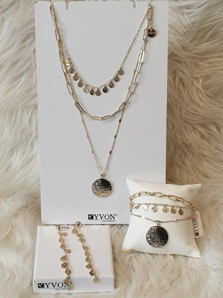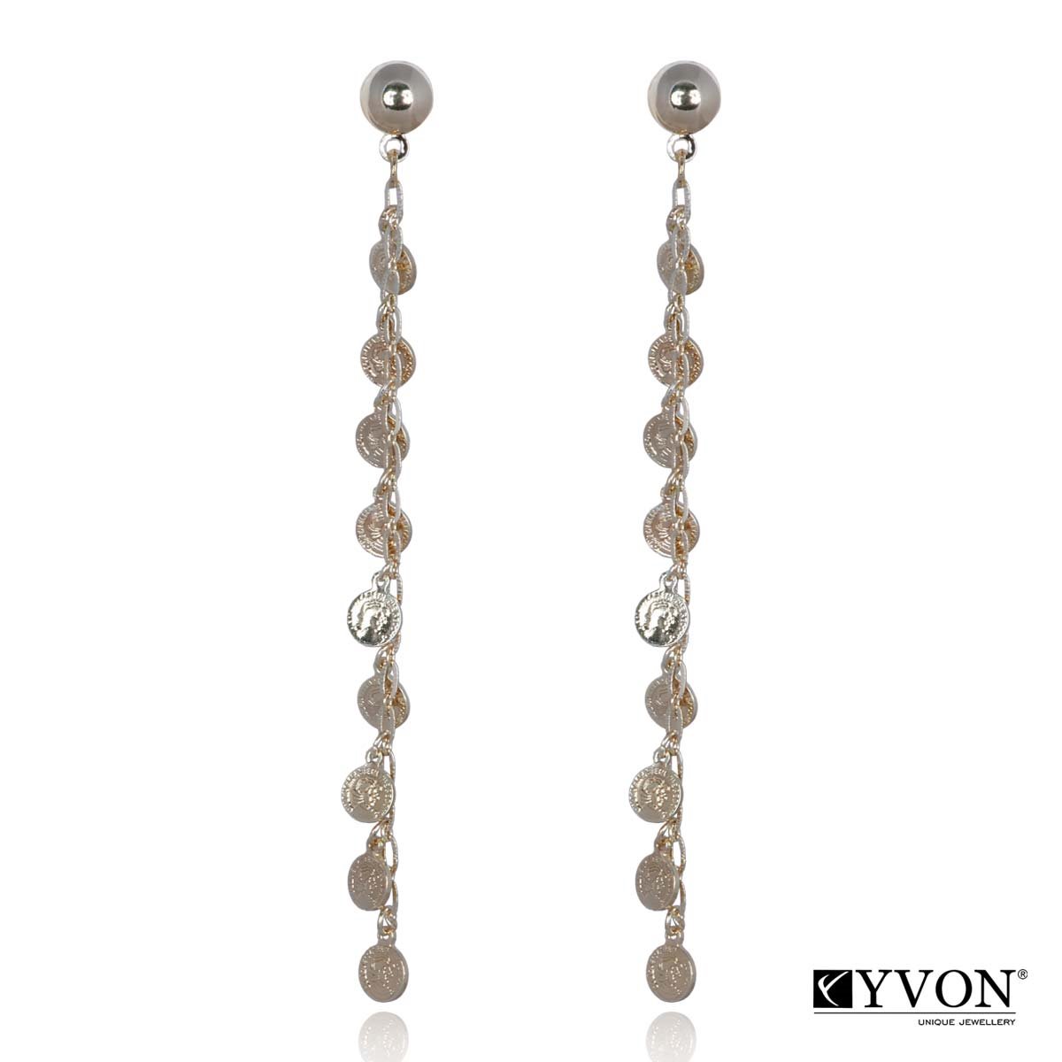 Eleganckie kolczyki, wykonane z antyalergicznego metalu (mosiądz) i przywieszek w kształcie monet. Znakomite uzupełnienie wieczorowych stylizacji. Długość 10 cm. Biżuteria YVON® jest w 100% antyalergiczna. Nie zawiera żadnych metali, które mogłyby w najmniejszym stopniu wywoływać uczuleniowe reakcje skórne. Może być noszona przez kobiety o wyjątkowo delikatnej skórze.