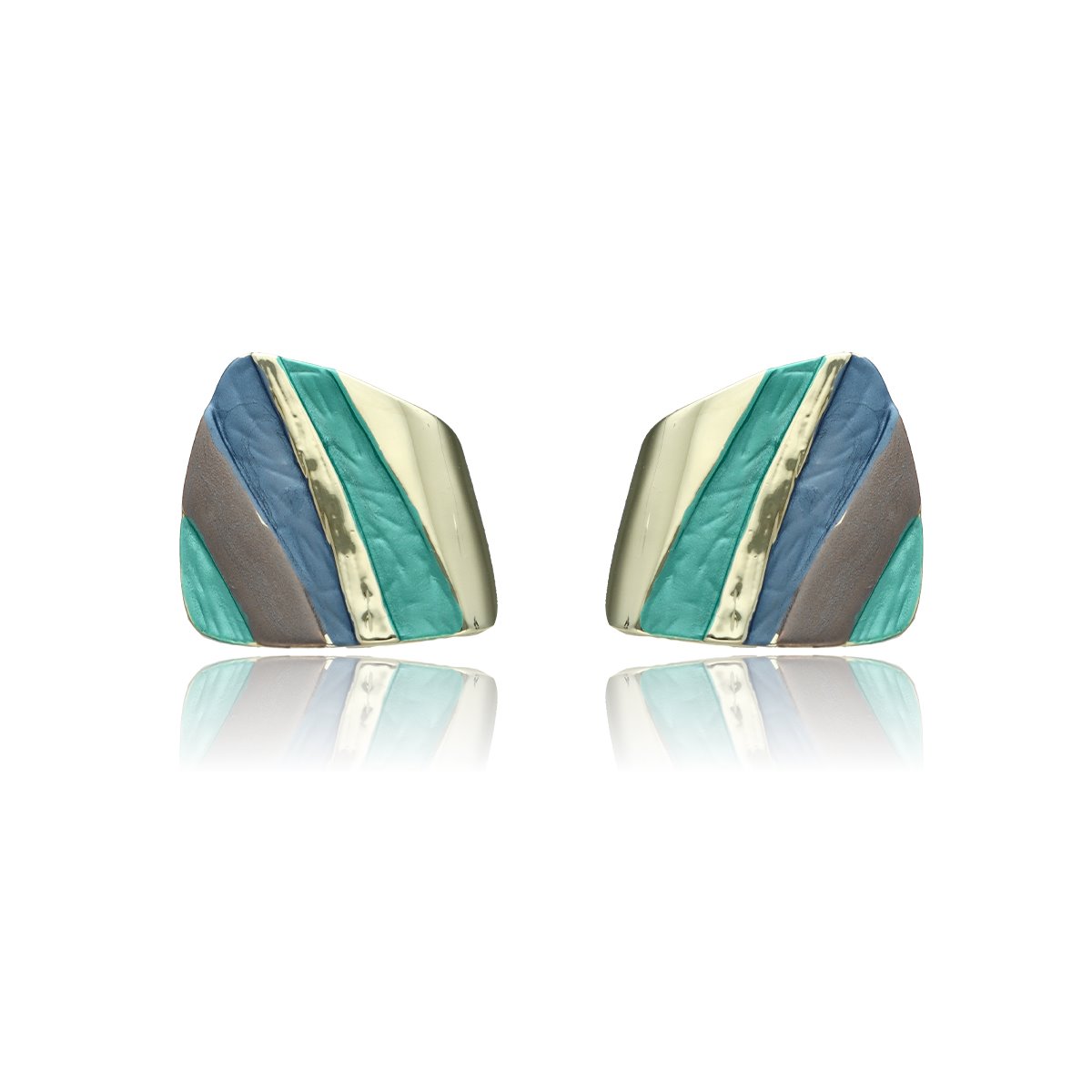 Opis produktu: Kolczyki o wielkości ok. 2 cm w formie geometrycznych elementów z nieregularnym układem pasów. Nowoczesny design i wyrazisty wzór nadają im charakteru, a jednocześnie pozostają lekkie i wygodne w noszeniu. Wykonane z hipoalergicznego metalu (zamak – stop cynku, bezpieczny dla wrażliwej skóry) oraz kolorowej emalii o subtelnym efekcie głębi. Do kompletu dostępny jest pasujący naszyjnik, bransoletka oraz pierścionek o tym samym indeksie numerycznym.