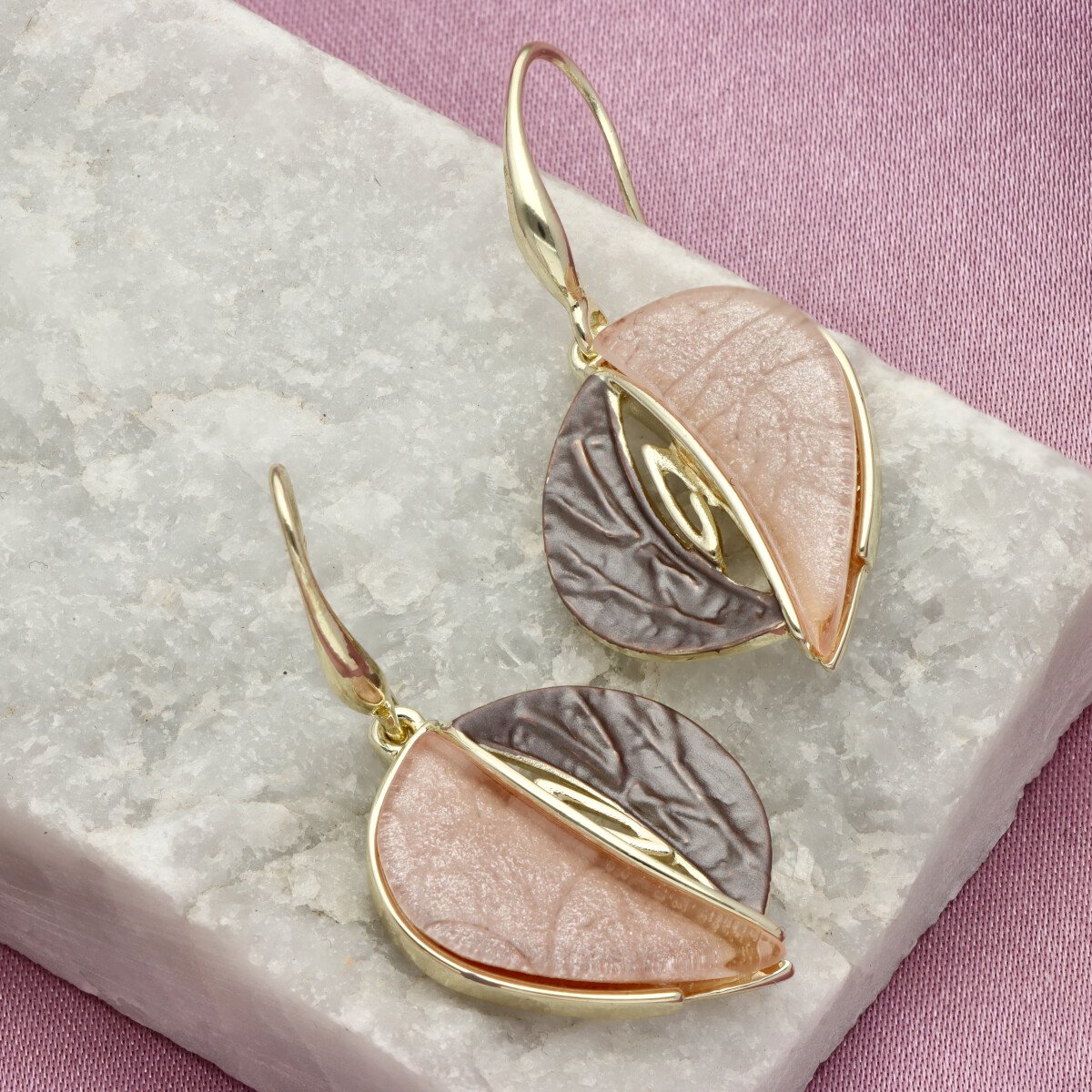 Kolczyki o długości ok. 3 cm w formie nowoczesnych liści o niestandardowej, przestrzennej budowie. Ich oryginalny kształt sprawia, że pięknie odbijają światło i stanowią wyrazisty element stylizacji.