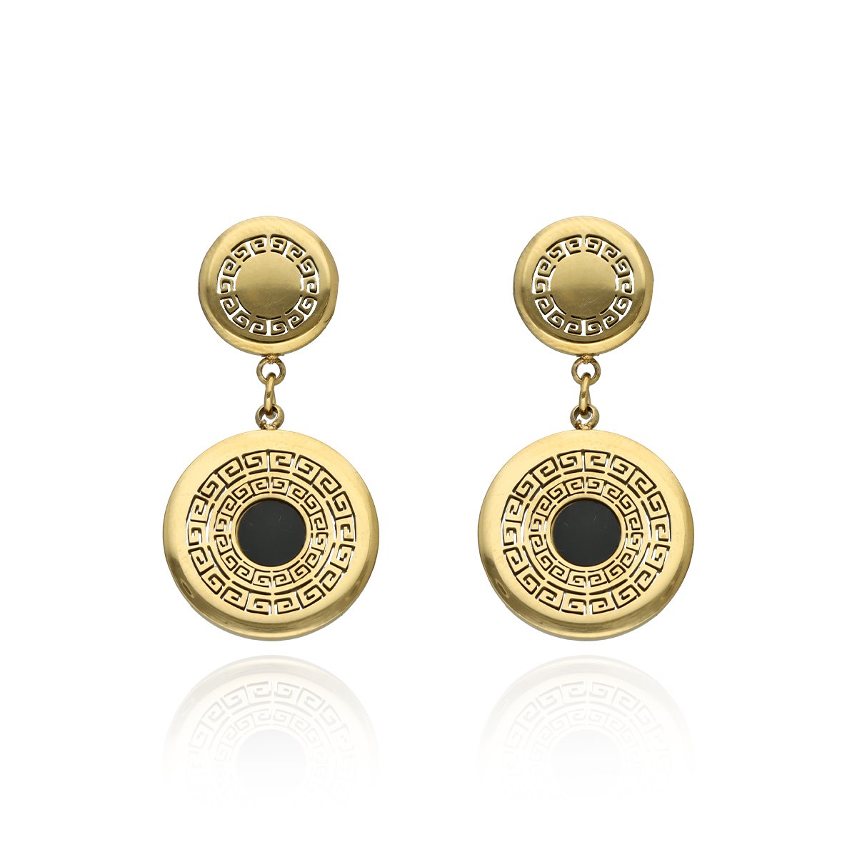 Kolczyki wykonane z hipoalergicznej stali 316L, pozłacanej 16-karatowym złotem. Model podwójny, składający się z dwóch połączonych elementów o średnicach 14 mm i 18 mm, co daje całkowitą długość ok. 3,5 cm.