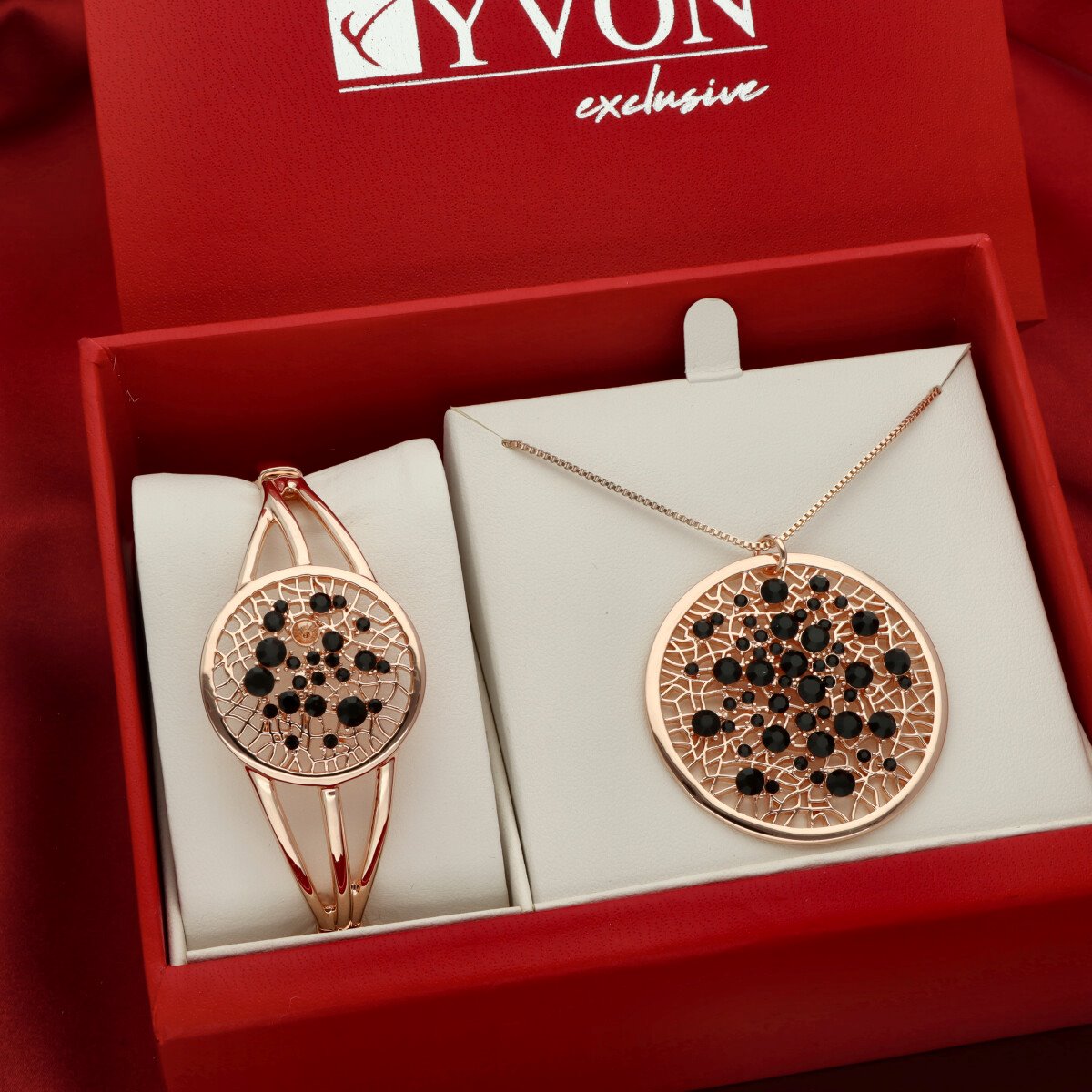Zestaw biżuterii Clarisse z kolekcji YVON Exclusive zachwyca misternym wzorem o strukturze delikatnej siateczki, ozdobionej drobnymi cyrkoniami. Każdy detal został wykonany z precyzją charakterystyczną dla biżuterii klasy premium. Komplet powstał z wysokiej jakości zamaku – hipoalergicznego stopu metali szeroko stosowanego w jubilerstwie, co gwarantuje trwałość i bezpieczeństwo noszenia. To biżuteria, która łączy subtelność z elegancją, stanowiąc efektowny akcent do każdej stylizacji. Naszyjnik ma długość 45 cm + 8 cm regulacja, natomiast bransoletka jest rozchylana, dzięki czemu łatwo dopasowuje się do nadgarstka. Całość zaprezentowana jest w luksusowym, czerwonym pudełku prezentowym YVON, które jest gratis.