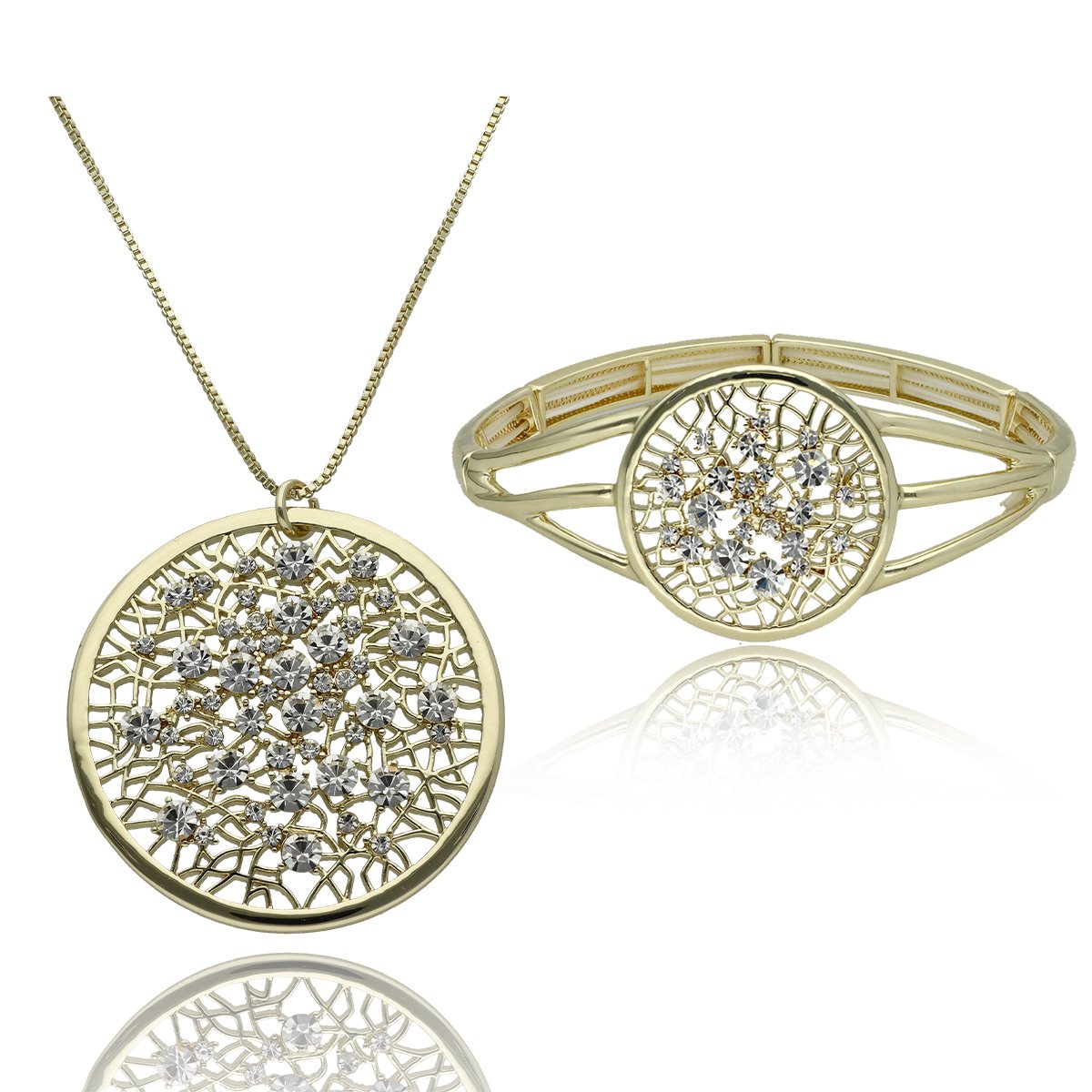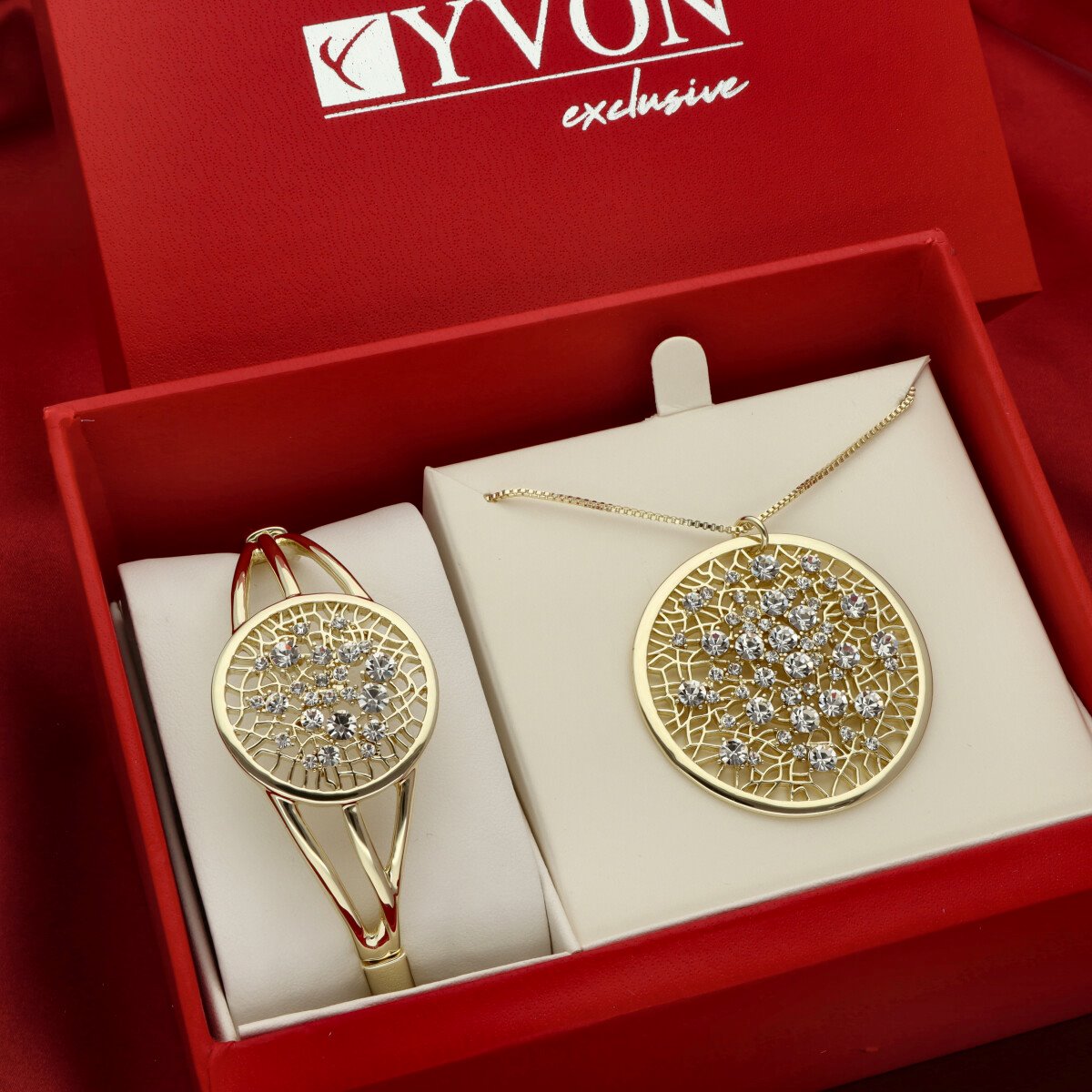Zestaw biżuterii Clarisse z kolekcji YVON Exclusive zachwyca misternym wzorem o strukturze delikatnej siateczki, ozdobionej drobnymi cyrkoniami. Każdy detal został wykonany z precyzją charakterystyczną dla biżuterii klasy premium. Komplet powstał z wysokiej jakości zamaku – hipoalergicznego stopu metali szeroko stosowanego w jubilerstwie, co gwarantuje trwałość i bezpieczeństwo noszenia. To biżuteria, która łączy subtelność z elegancją, stanowiąc efektowny akcent do każdej stylizacji. Naszyjnik ma długość 45 cm + 8 cm regulacja, natomiast bransoletka jest rozchylana, dzięki czemu łatwo dopasowuje się do nadgarstka. Całość zaprezentowana jest w luksusowym, czerwonym pudełku prezentowym YVON, które jest gratis.