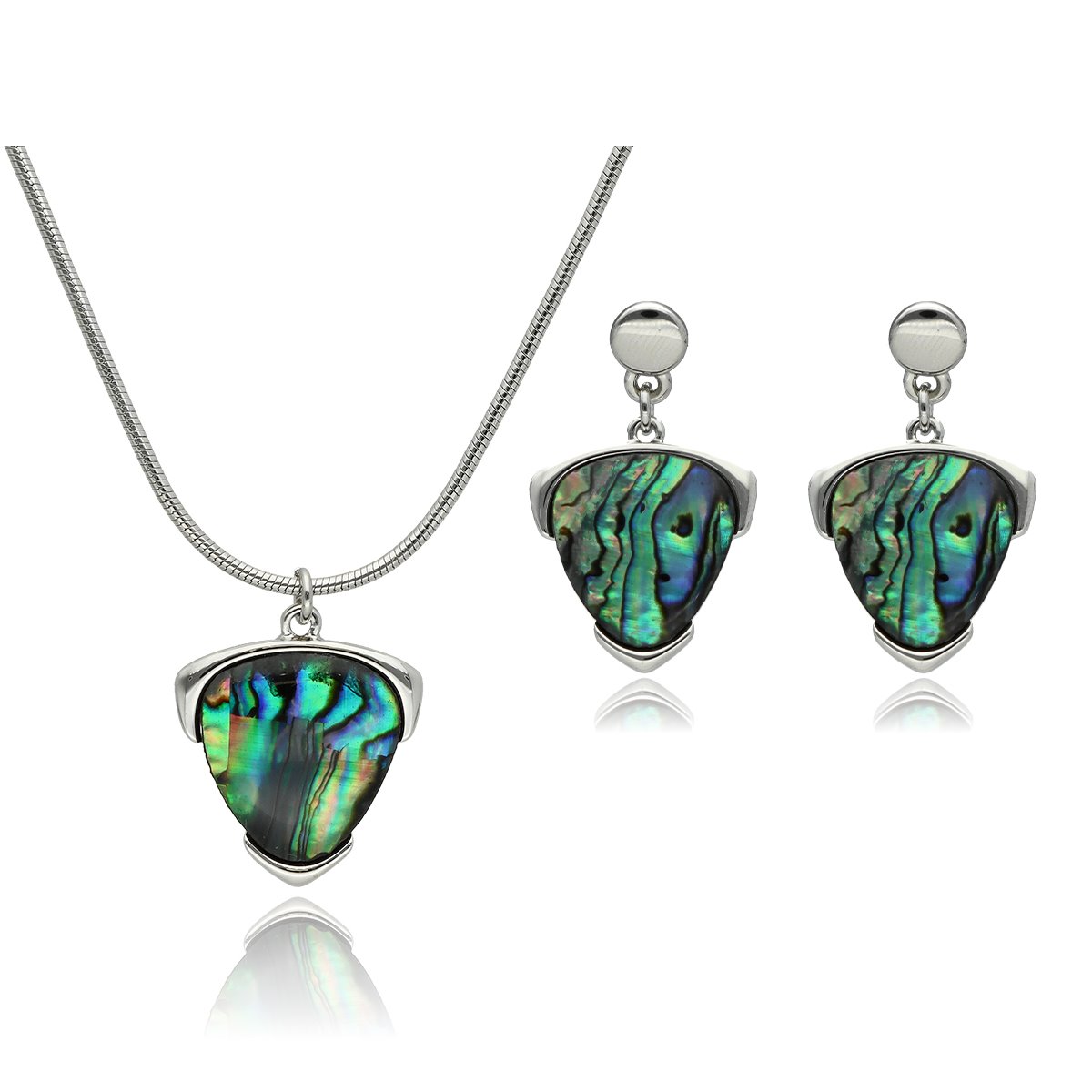 Komplet biżuterii składający się z naszyjnika oraz kolczyków, zapakowany w pudełko prezentowe. Wykonany z hipoalergicznego metalu oraz muszli ABALON. Lekka forma zapewnia komfort codziennego użytkowania. Długość naszyjnika wynosi 42 cm, dodatkowo 8 cm zawieszki. Długość kolczyków to około 3 cm. Specyfikacja: zestaw: naszyjnik + kolczyki materiał: hipoalergiczny metal, muszla abalon długość naszyjnika: 42 cm + 8 cm zawieszka długość kolczyków: ok. 3 cm pudełko prezentowe w zestawie