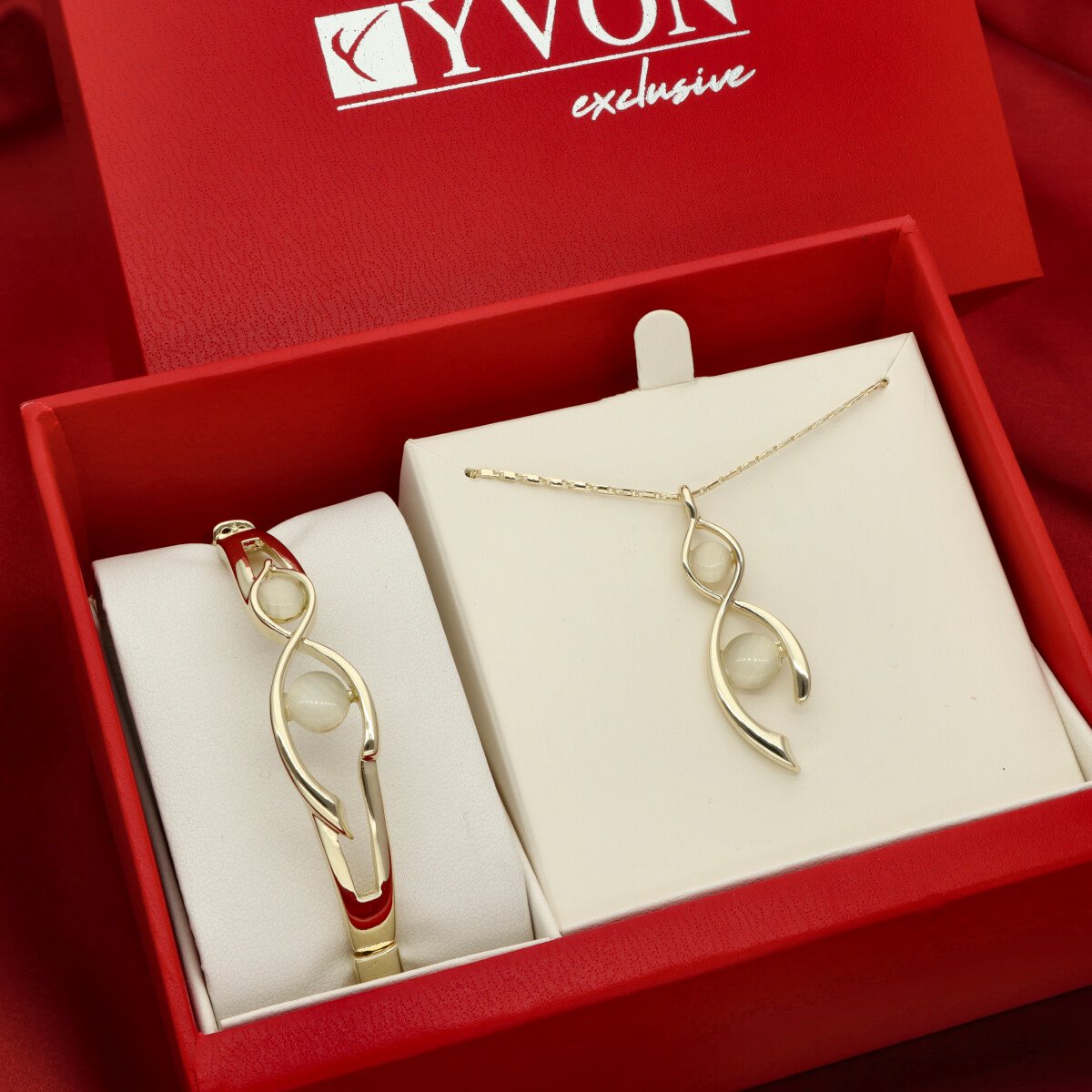 Zestaw biżuterii Lumina z kolekcji YVON Exclusive to elegancki komplet składający się z naszyjnika i bransoletki wykonanych z kwarcu oraz antyalergicznego stopu metali – zamaku. Zamak to trwały materiał jubilerski o wysokiej odporności na korozję i zachowanie połysku. Wszystkie elementy zostały starannie wykończone i zaprezentowane w dużym, czerwonym pudełku prezentowym YVON.