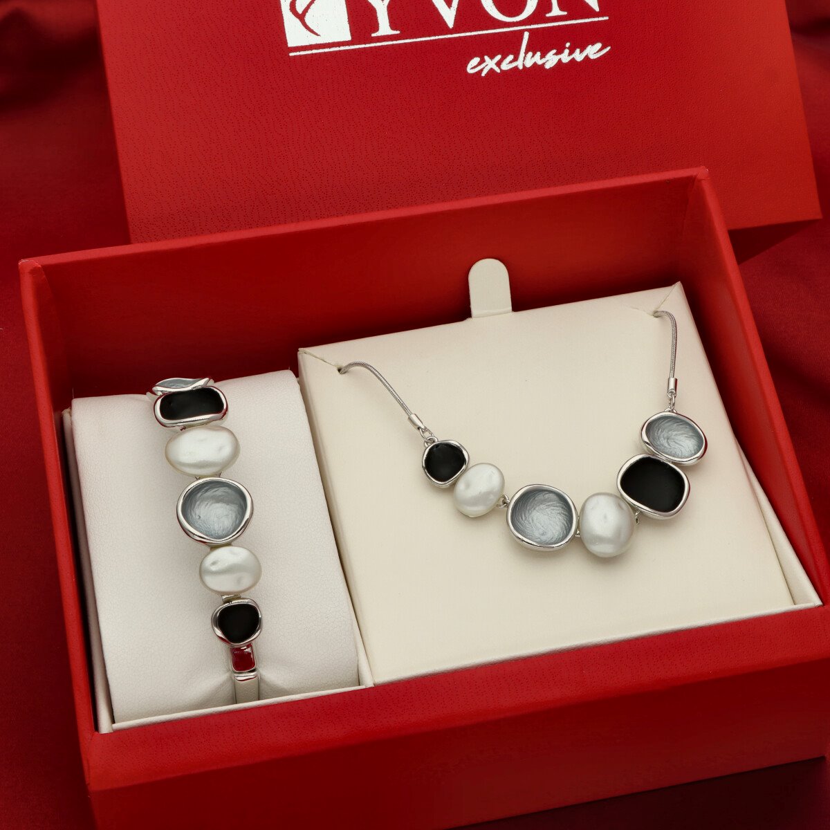 Zestaw biżuterii YVON Exclusive składający się z naszyjnika i bransoletki wykonanych z wysokiej jakości materiałów. Elementy ozdobne tworzy połączenie perły Shell oraz ręcznie nanoszonej emalii, umieszczonych w eleganckiej metalowej oprawie. Całość utrzymana w klasycznym stylu, doskonale sprawdzi się jako prezent na każdą okazję, zwłaszcza w sezonie świątecznym. Biżuteria jest w 100% antyalergiczna, nie zawiera niklu, kadmu ani ołowiu. Naszyjnik ma długość 45 cm + 8 cm regulacja, bransoletka posiada rozmiar uniwersalny na elastycznych gumkach, dzięki czemu dopasowuje się do nadgarstka. Dekoracyjne czerwone pudełko prezentowe YVON jest gratis.