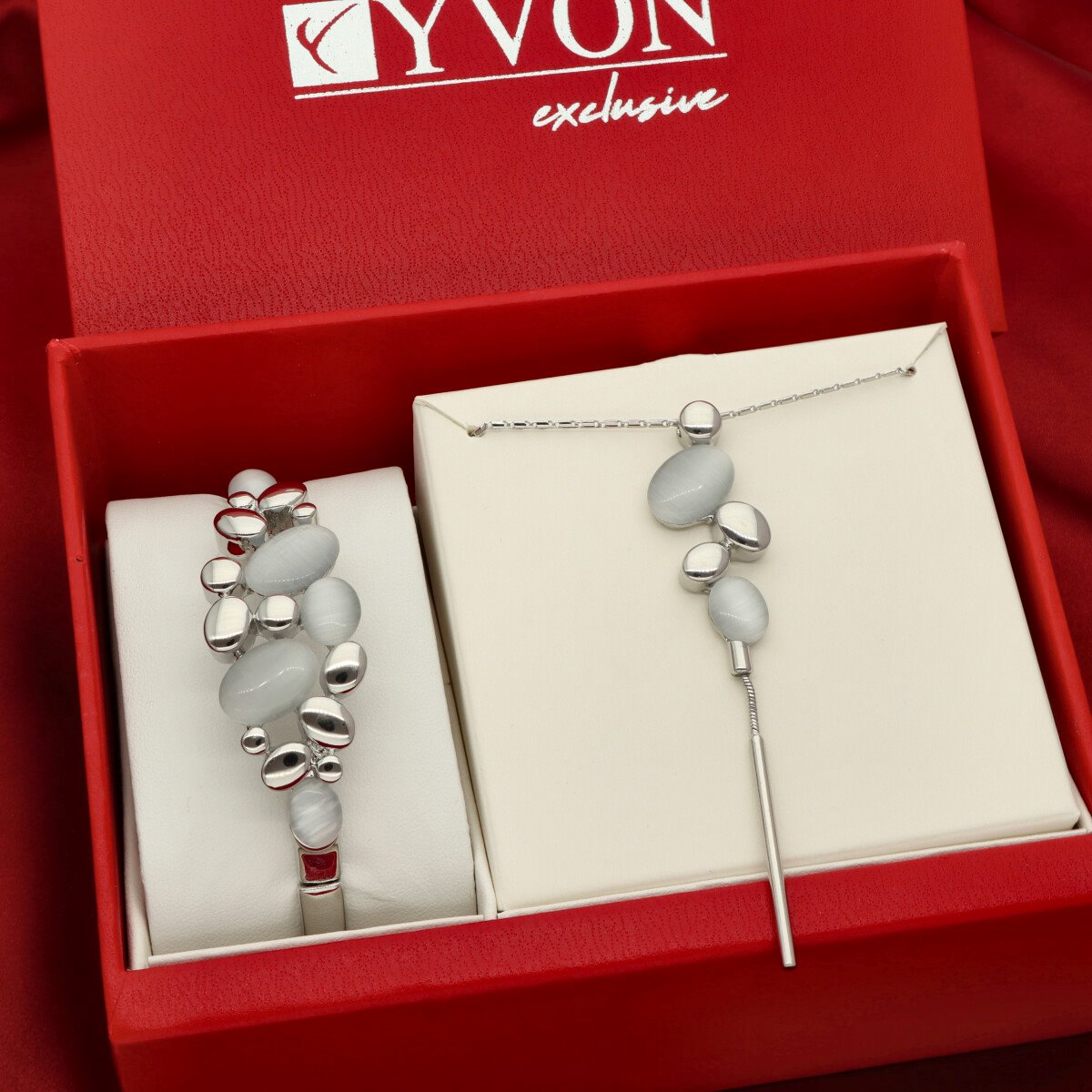 Zestaw biżuterii Lumina z kolekcji YVON Exclusive to elegancki komplet składający się z naszyjnika i bransoletki wykonanych z kwarcu oraz antyalergicznego stopu metali – zamaku. Zamak to trwały materiał jubilerski o wysokiej odporności na korozję i zachowanie połysku. Wszystkie elementy zostały starannie wykończone i zaprezentowane w dużym, czerwonym pudełku prezentowym YVON. Biżuteria jest w 100% antyalergiczna i bezpieczna dla skóry. Naszyjnik ma długość 45 cm + 8 cm regulacja, bransoletka posiada rozmiar uniwersalny na elastycznych gumkach, dopasowujących się do każdej ręki. Dekoracyjne pudełko prezentowe YVON jest gratis.