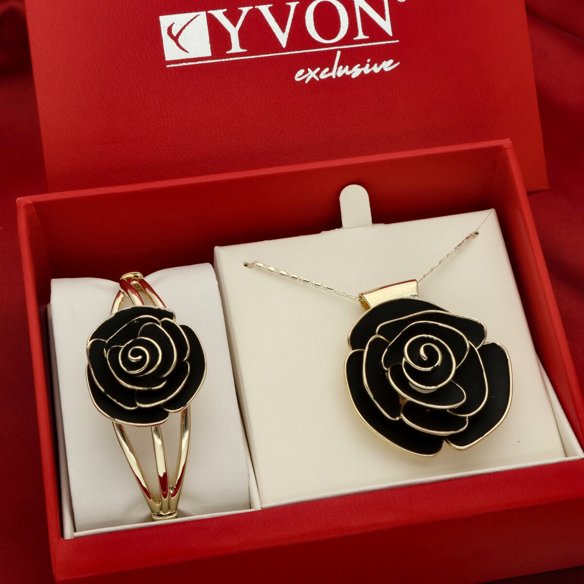 Zestaw biżuterii YVON Exclusive wykonany z wysokiej jakości zamaku, hipoalergicznego stopu metali szeroko stosowanego w jubilerstwie. Elementy ozdobne pokryte są ręcznie nanoszoną emalią, która nadaje biżuterii wyjątkowy połysk i trwałość. Każdy detal został starannie wykończony, tworząc elegancki komplet o nowoczesnej formie. Biżuteria jest w 100% hipoalergiczna, bez niklu, kadmu i ołowiu, dzięki czemu jest bezpieczna dla skóry. Naszyjnik ma długość 45 cm + 8 cm regulacja, natomiast bransoletka posiada rozmiar uniwersalny na elastycznych gumkach, dopasowujących się do każdej ręki. Całość zaprezentowana jest w efektownym, czerwonym pudełku prezentowym YVON, które jest gratis.