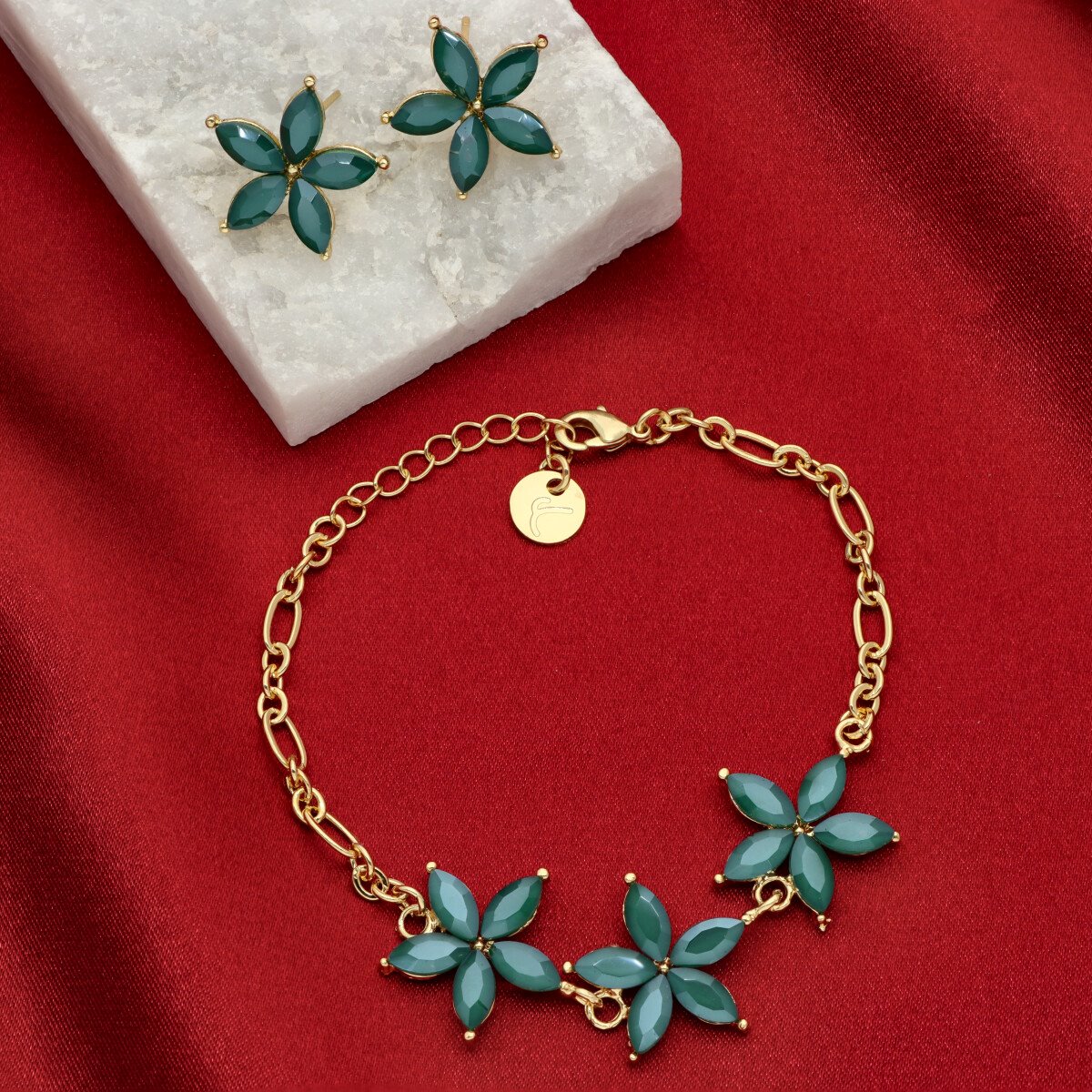 Uroczy, niezwykle kobiecy zestaw biżuterii wizytowej, który subtelnie podkreśla elegancję stylizacji. Komplet składa się z regulowanej bransoletki oraz efektownych kolczyków o długości ok 2 cm, które pięknie wysmuklają szyję i dodają lekkości całej sylwetce.