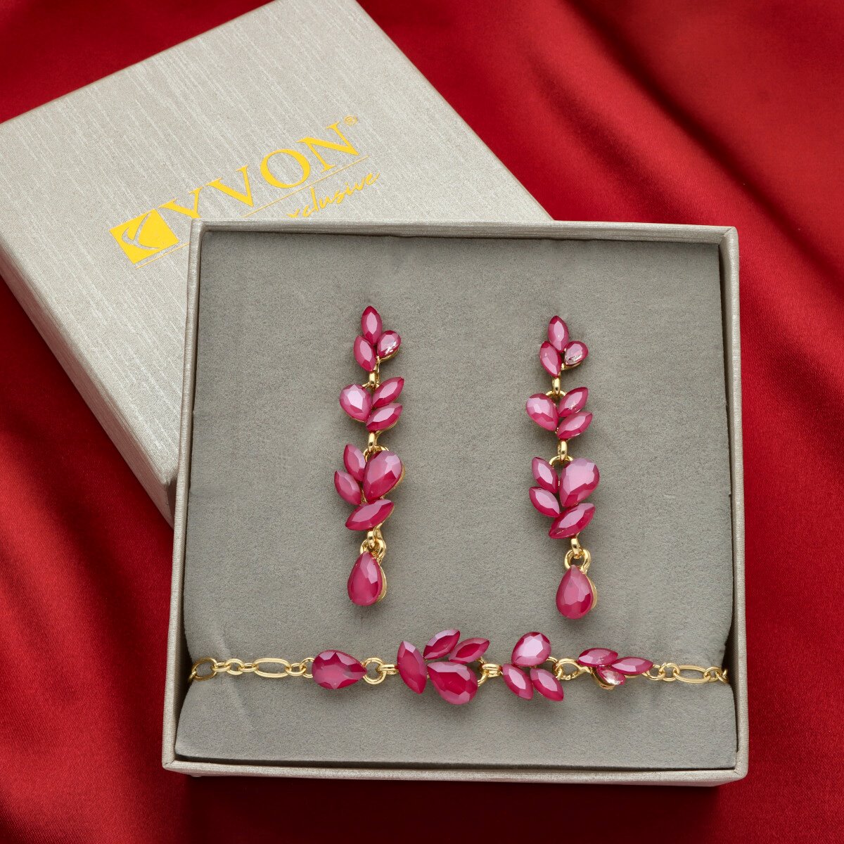 Uroczy, niezwykle kobiecy zestaw biżuterii wizytowej, który subtelnie podkreśla elegancję stylizacji. Komplet składa się z regulowanej bransoletki oraz efektownych kolczyków o długości 6 cm, które pięknie wysmuklają szyję i dodają lekkości całej sylwetce.