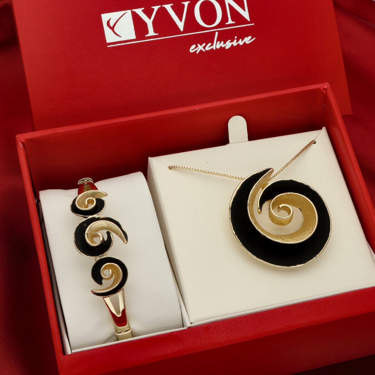 Zestaw biżuterii YVON Exclusive wykonany z wysokiej jakości zamaku, hipoalergicznego stopu metali szeroko stosowanego w jubilerstwie. Elementy ozdobne pokryte są ręcznie nanoszoną emalią, która nadaje biżuterii wyjątkowy połysk i trwałość. Każdy detal został starannie wykończony, tworząc elegancki komplet o nowoczesnej formie.
