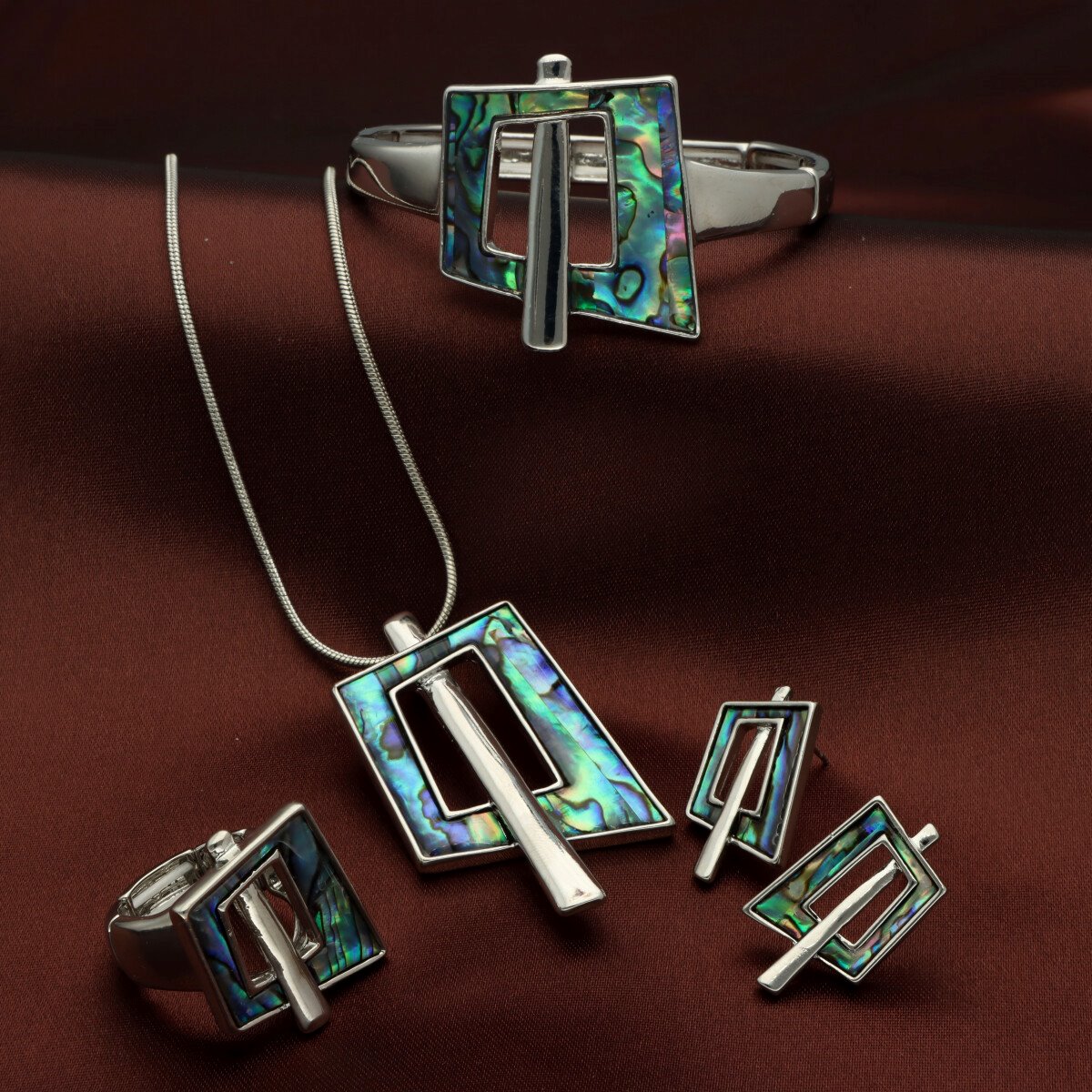 Elegancki, krótki naszyjnik wykonany z metalu antyalergicznego, ozdobiony efektowną zawieszką o długości ok. 5 cm. Zawieszka została wykonana z naturalnej muszli Abalonej, tworząc harmonijne, przyciągające uwagę połączenie.